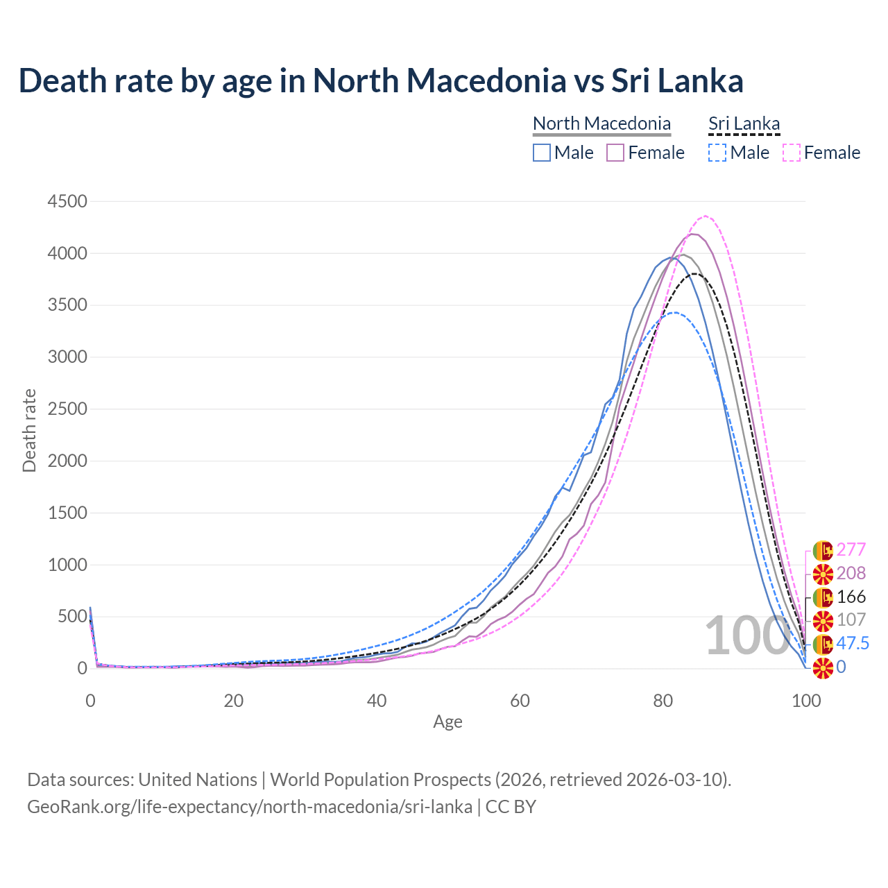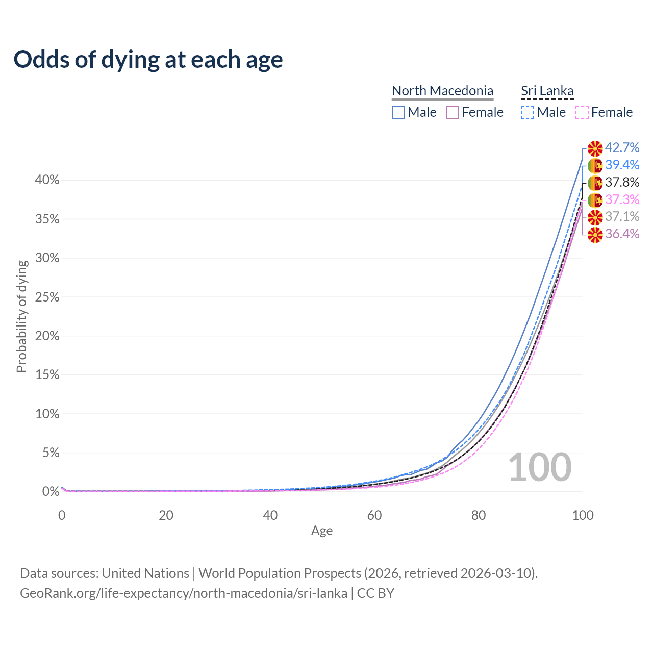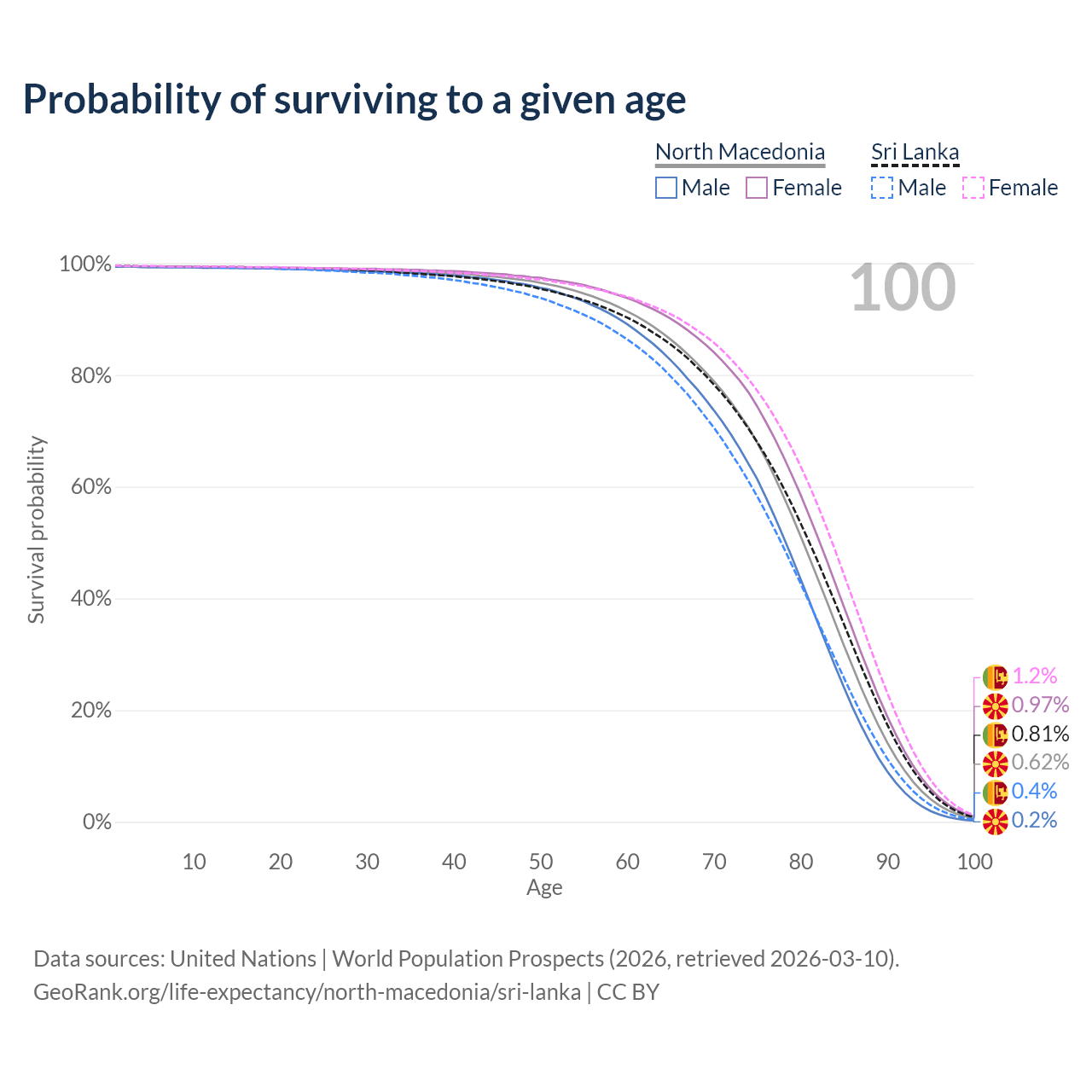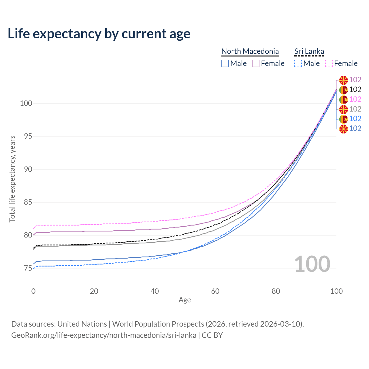 This life expectancy calculator shows the odds of living to 100, 95, 90, and below based on current age for both males and females in North Macedonia and Sri Lanka, along with mean and median age of death. The calculations are based on the 2026 life tables (actuarial tables) from the UN World Population Prospects.