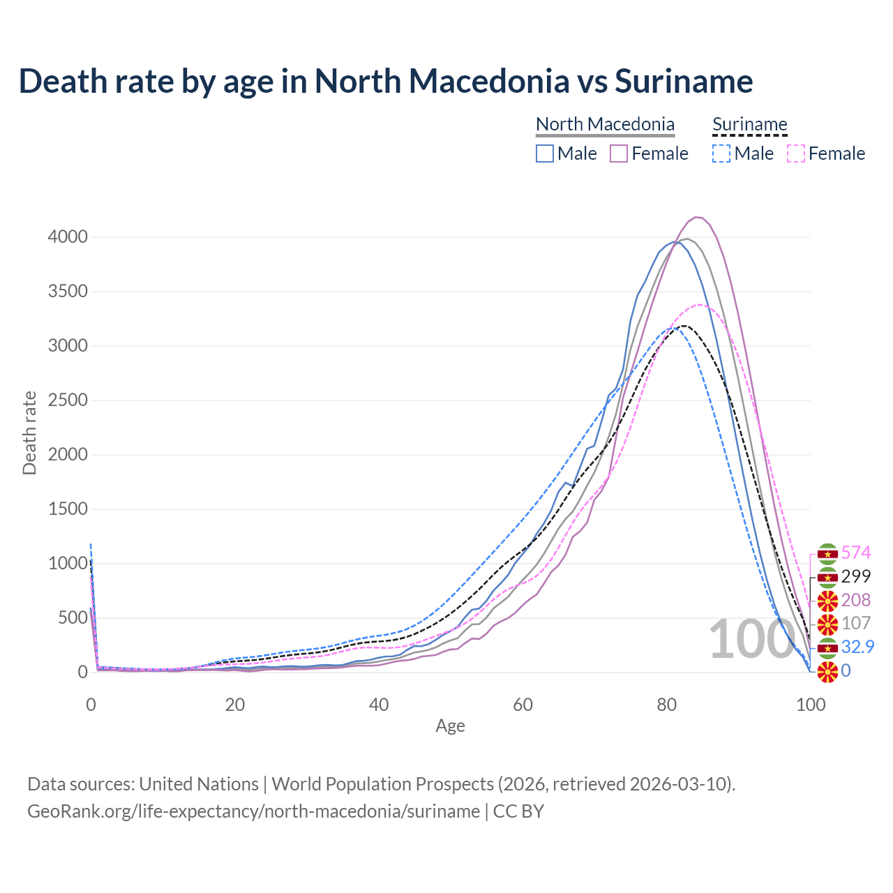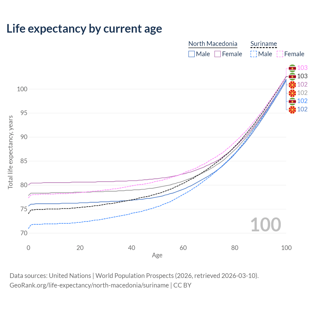 This life expectancy calculator shows the odds of living to 100, 95, 90, and below based on current age for both males and females in North Macedonia and Suriname, along with mean and median age of death. The calculations are based on the 2026 life tables (actuarial tables) from the UN World Population Prospects.