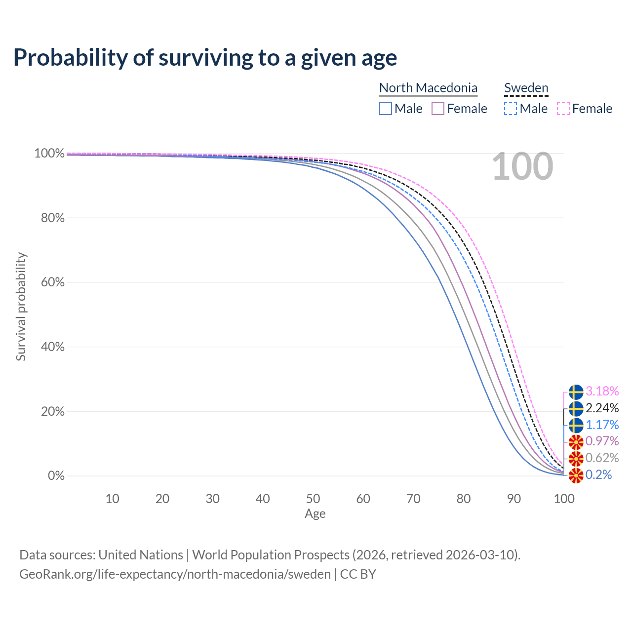 This life expectancy calculator shows the odds of living to 100, 95, 90, and below based on current age for both males and females in North Macedonia and Sweden, along with mean and median age of death. The calculations are based on the 2026 life tables (actuarial tables) from the UN World Population Prospects.