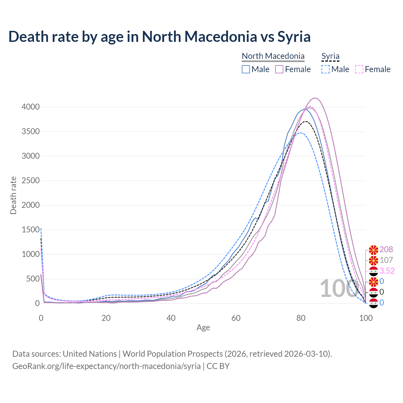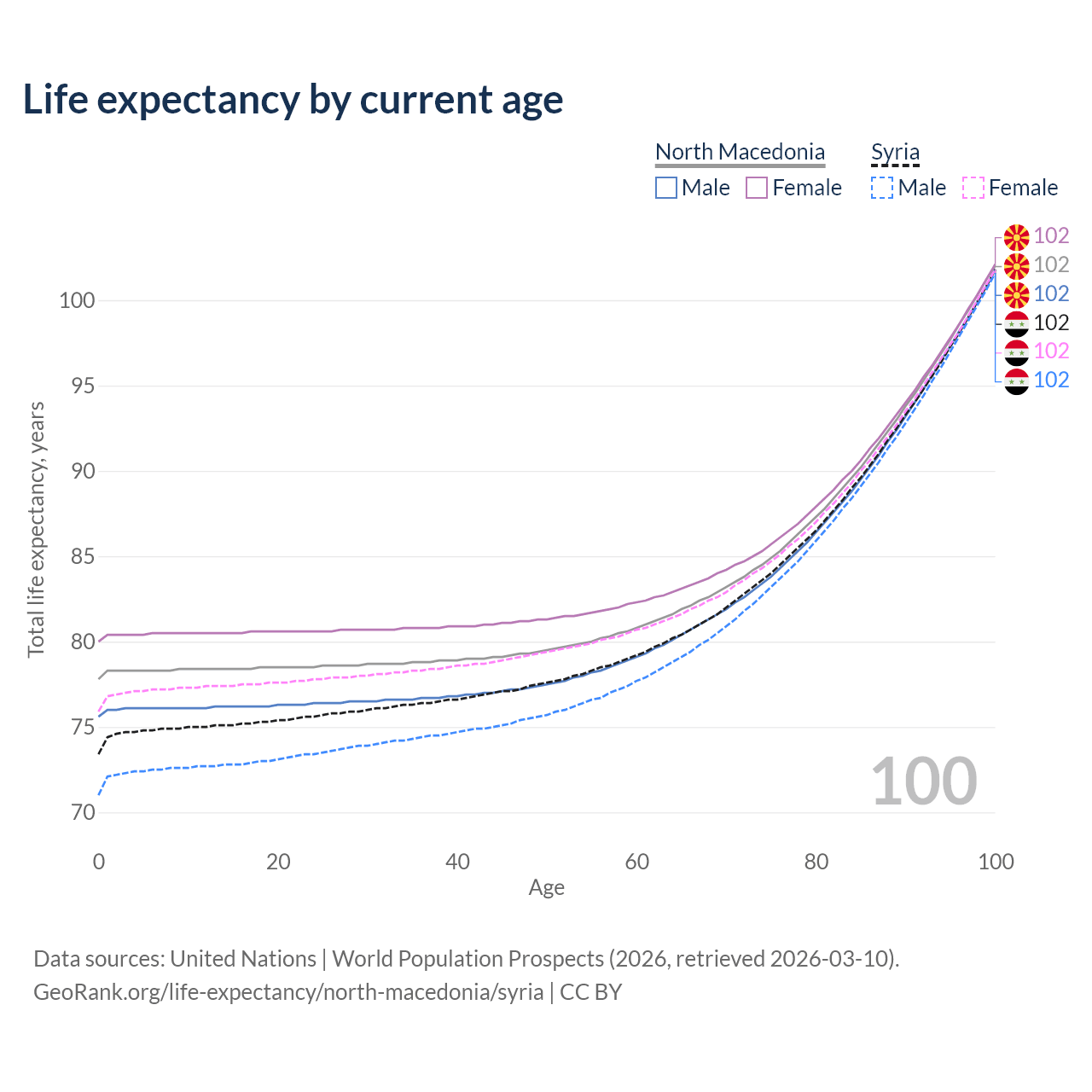This life expectancy calculator shows the odds of living to 100, 95, 90, and below based on current age for both males and females in North Macedonia and Syria, along with mean and median age of death. The calculations are based on the 2026 life tables (actuarial tables) from the UN World Population Prospects.