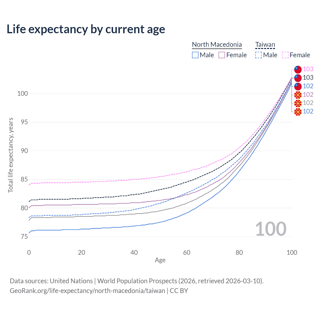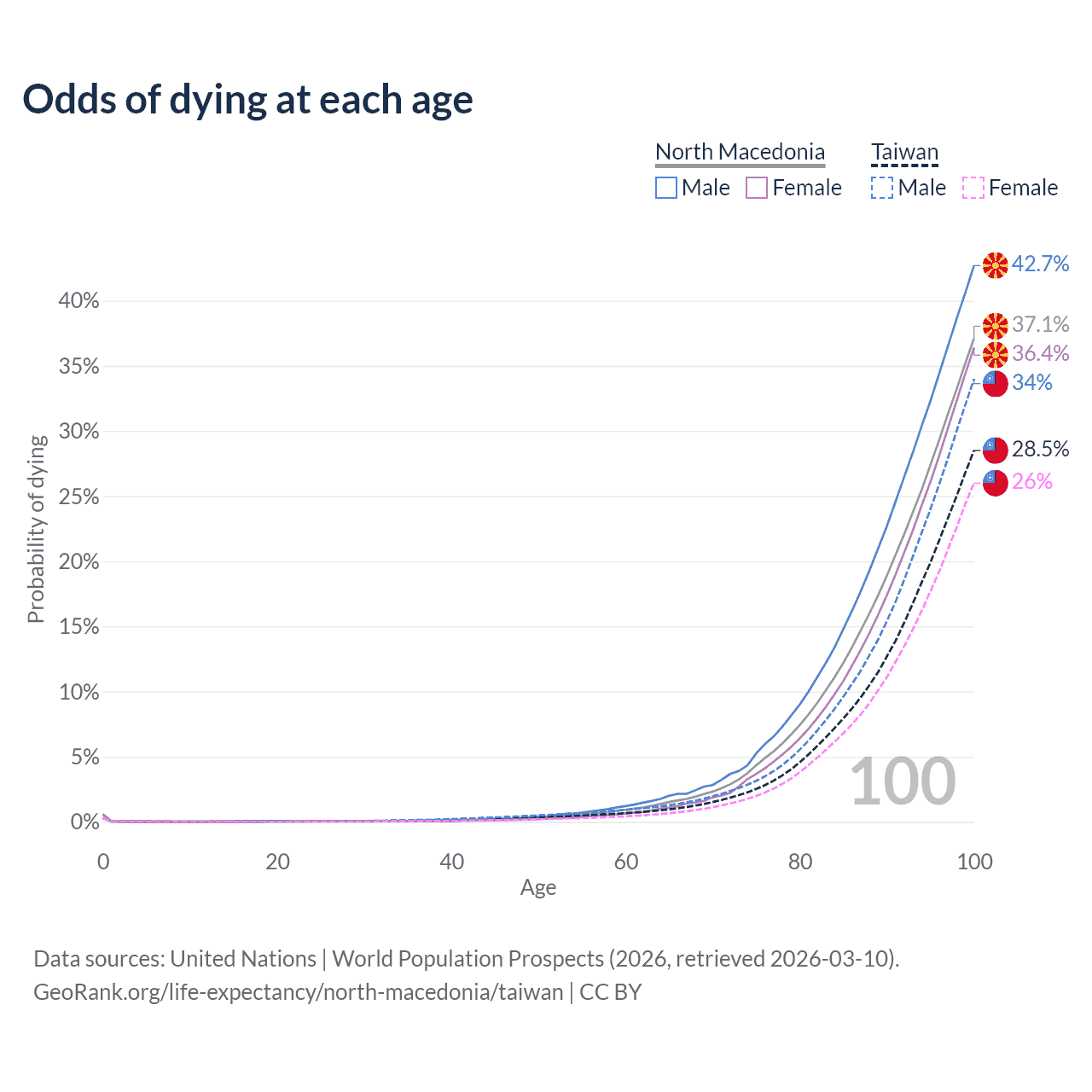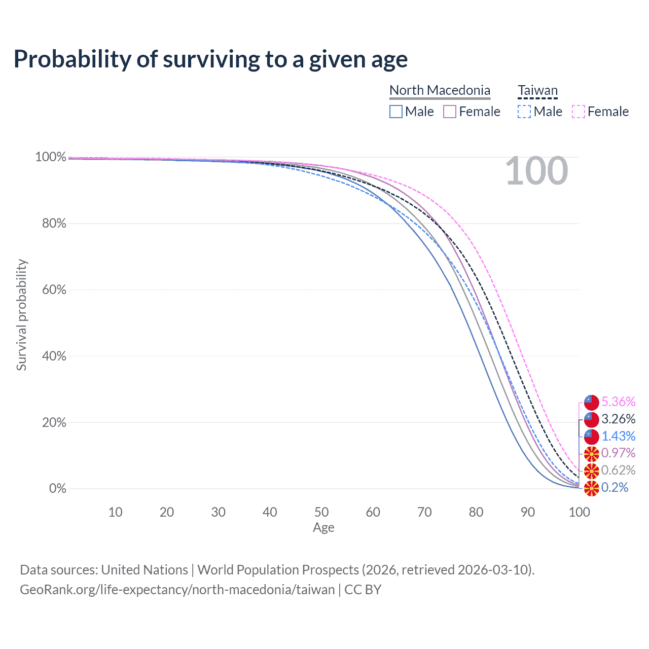 This life expectancy calculator shows the odds of living to 100, 95, 90, and below based on current age for both males and females in North Macedonia and Taiwan, along with mean and median age of death. The calculations are based on the 2026 life tables (actuarial tables) from the UN World Population Prospects.