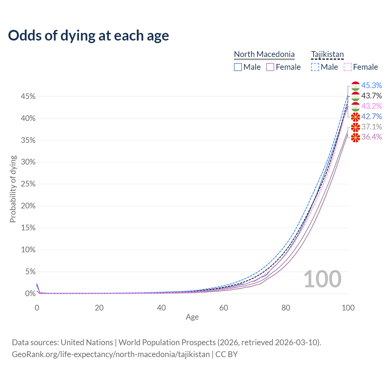 This life expectancy calculator shows the odds of living to 100, 95, 90, and below based on current age for both males and females in North Macedonia and Tajikistan, along with mean and median age of death. The calculations are based on the 2026 life tables (actuarial tables) from the UN World Population Prospects.
