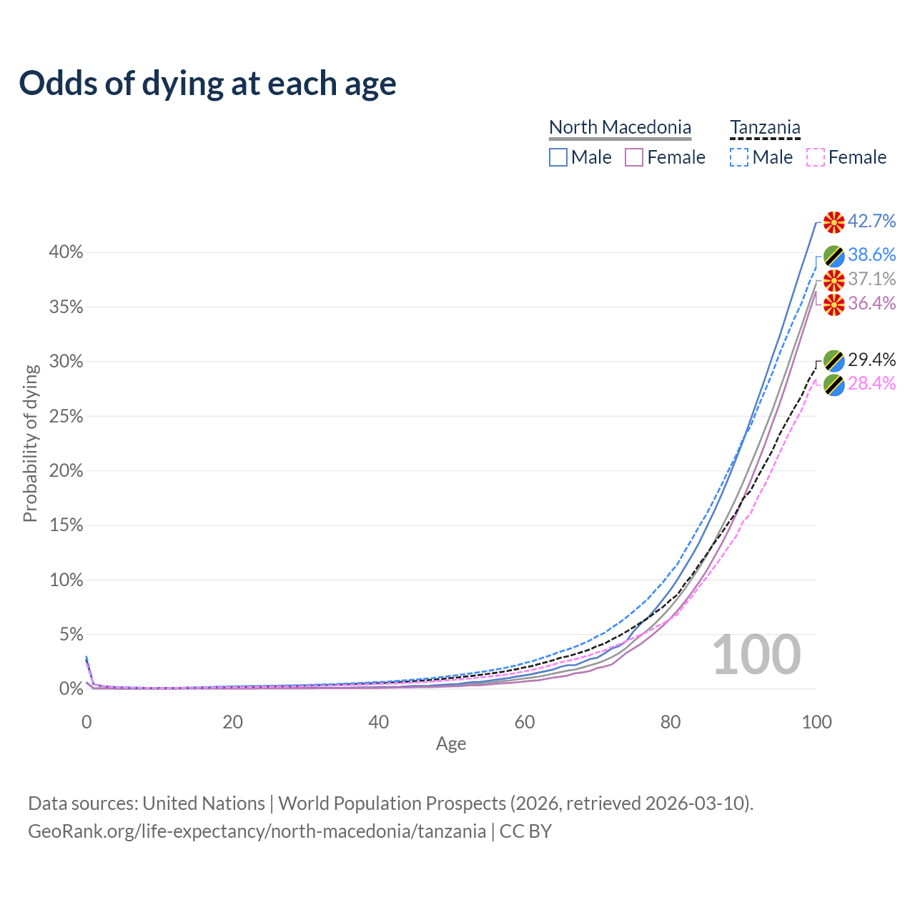 This life expectancy calculator shows the odds of living to 100, 95, 90, and below based on current age for both males and females in North Macedonia and Tanzania, along with mean and median age of death. The calculations are based on the 2026 life tables (actuarial tables) from the UN World Population Prospects.