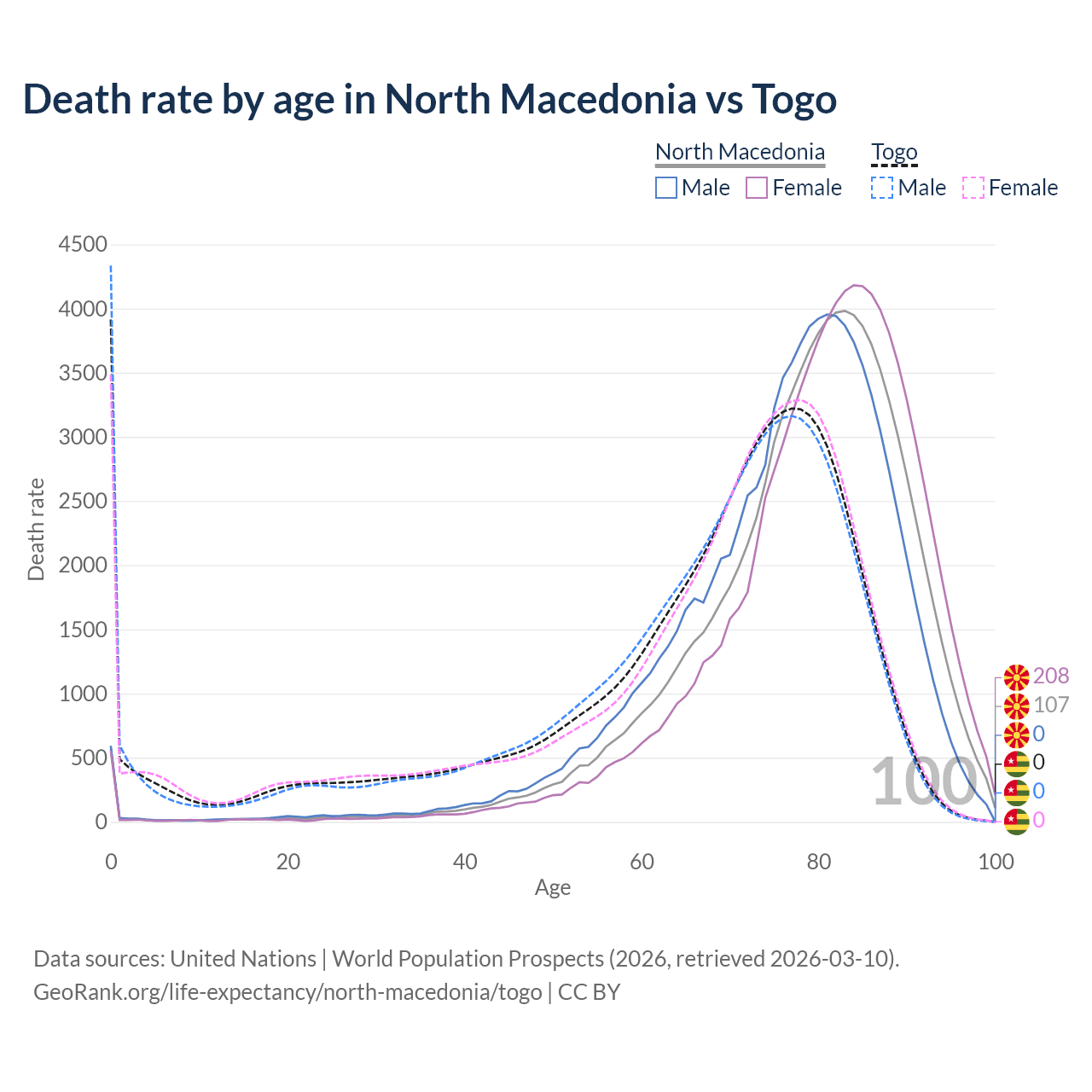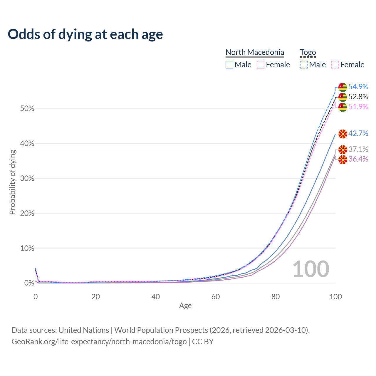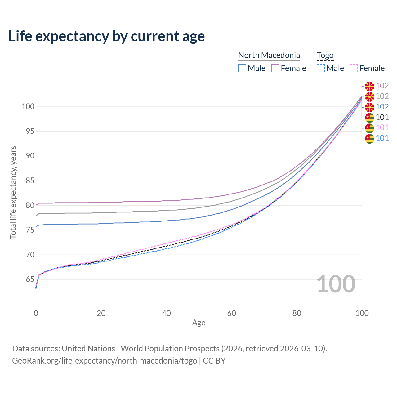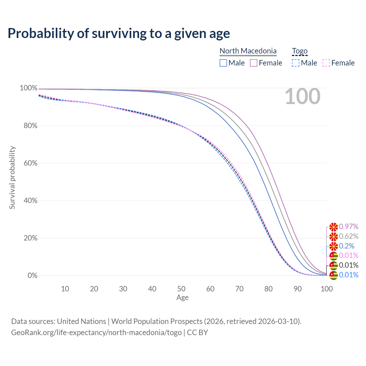 This life expectancy calculator shows the odds of living to 100, 95, 90, and below based on current age for both males and females in North Macedonia and Togo, along with mean and median age of death. The calculations are based on the 2026 life tables (actuarial tables) from the UN World Population Prospects.
