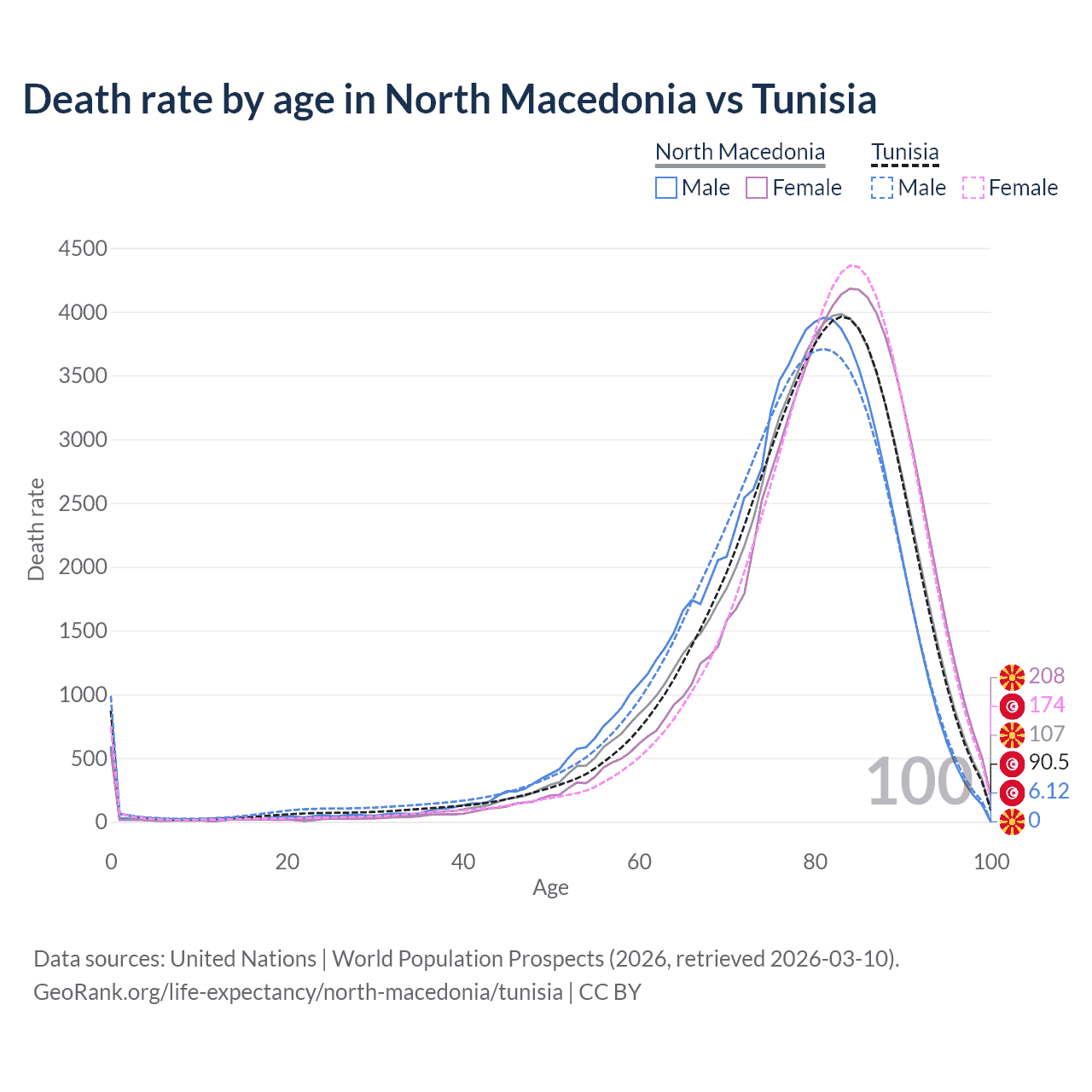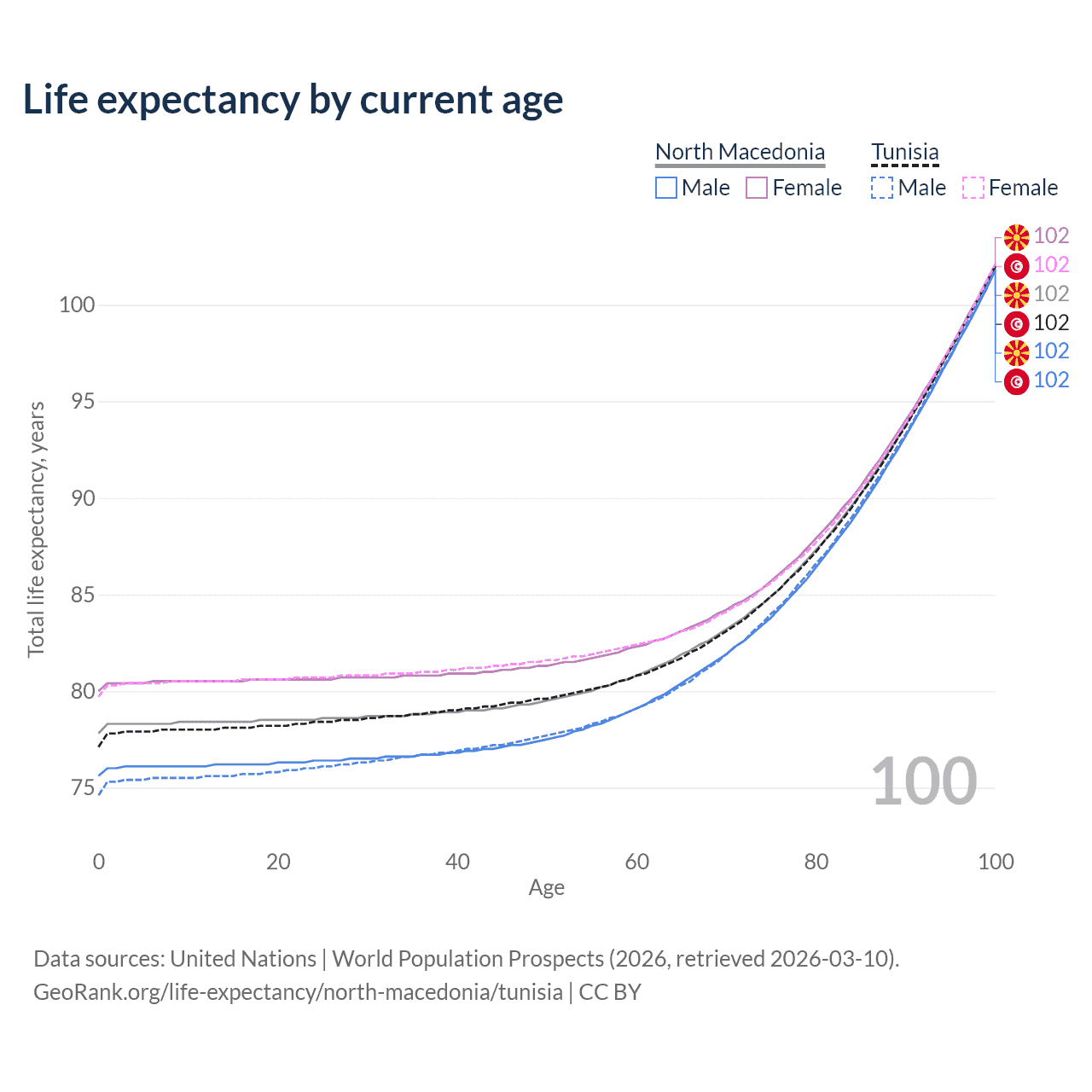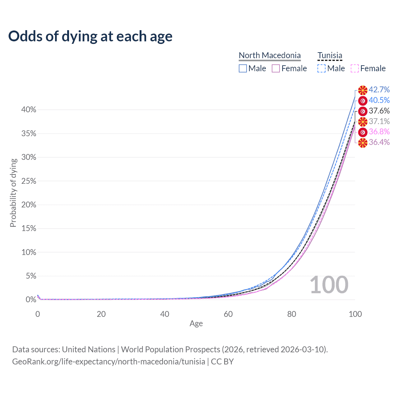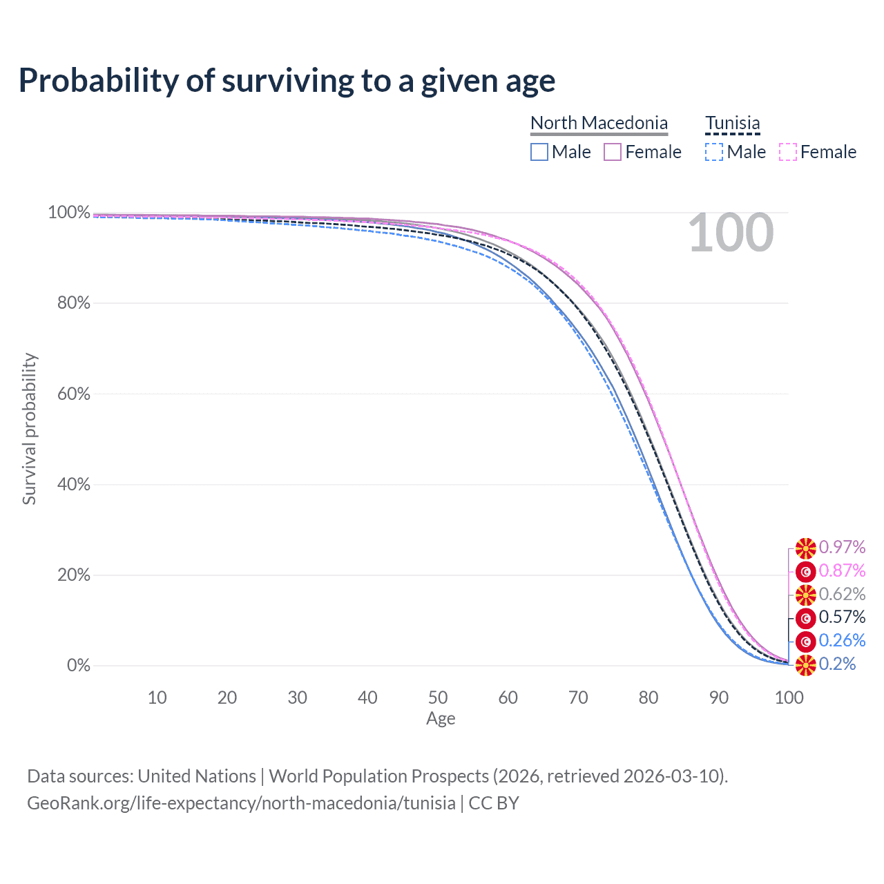 This life expectancy calculator shows the odds of living to 100, 95, 90, and below based on current age for both males and females in North Macedonia and Tunisia, along with mean and median age of death. The calculations are based on the 2026 life tables (actuarial tables) from the UN World Population Prospects.
