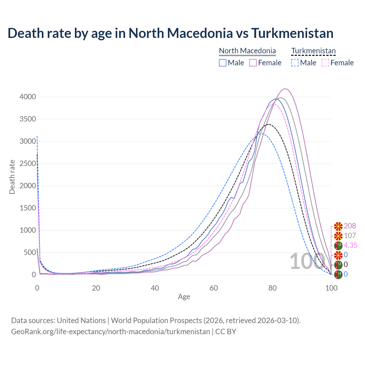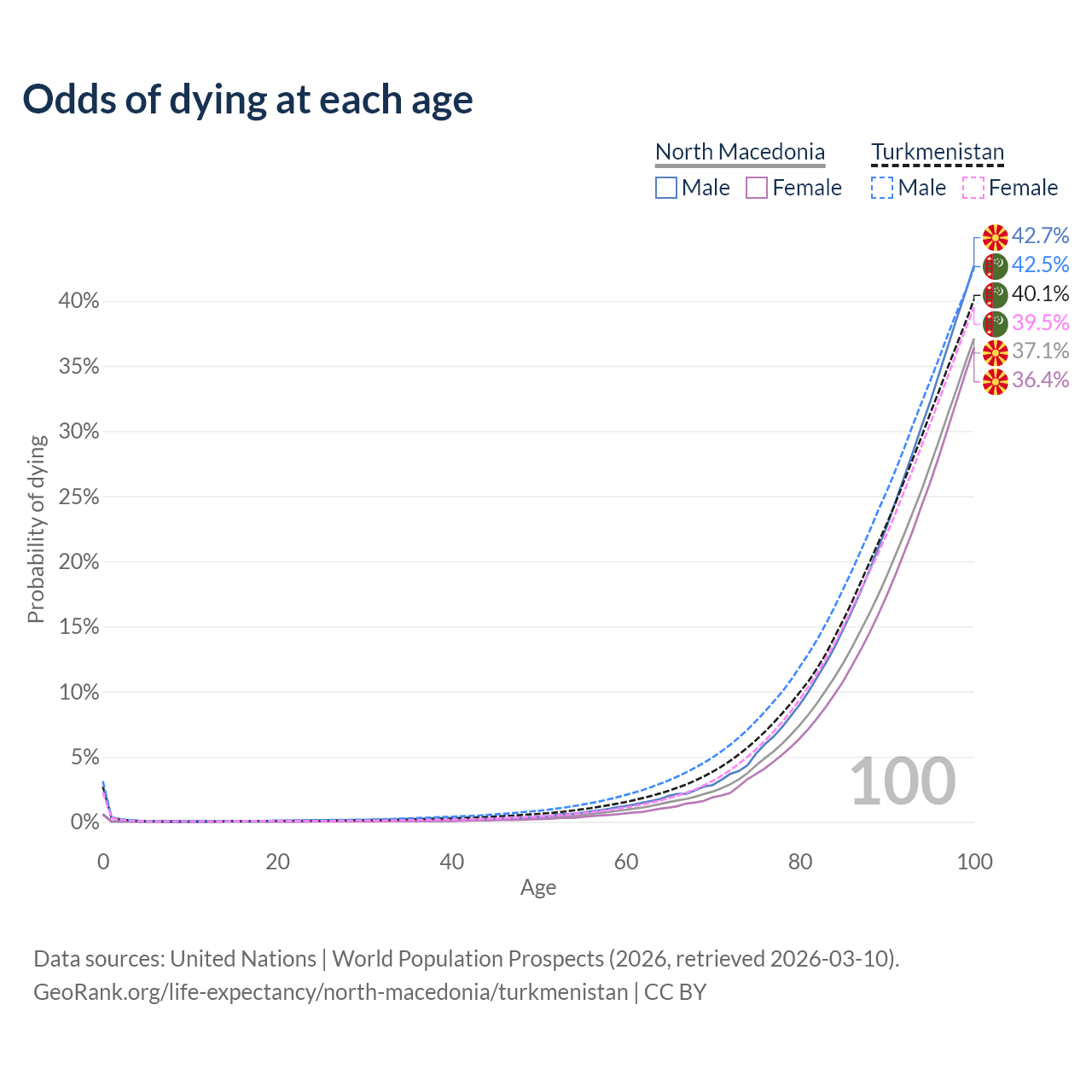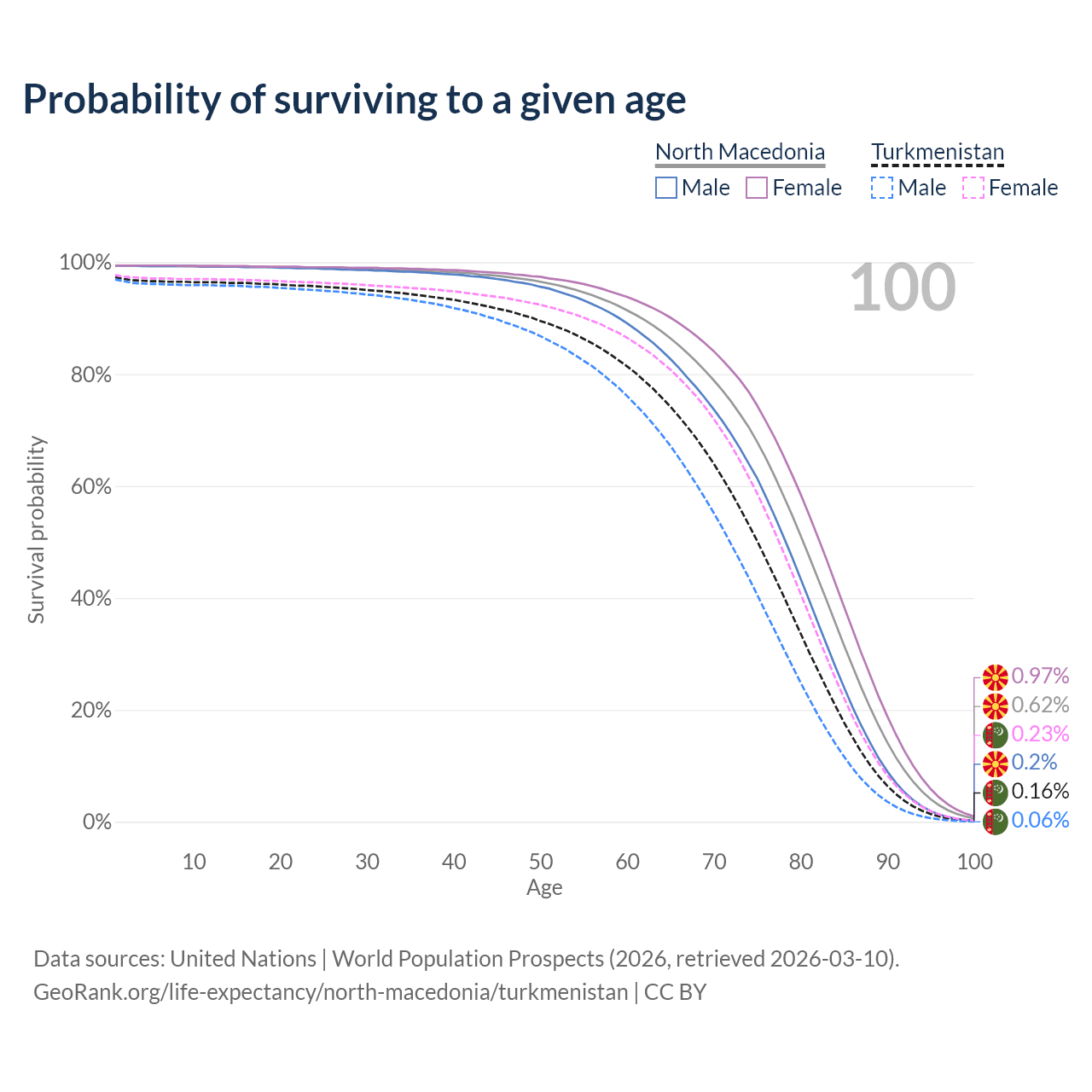 This life expectancy calculator shows the odds of living to 100, 95, 90, and below based on current age for both males and females in North Macedonia and Turkmenistan, along with mean and median age of death. The calculations are based on the 2026 life tables (actuarial tables) from the UN World Population Prospects.