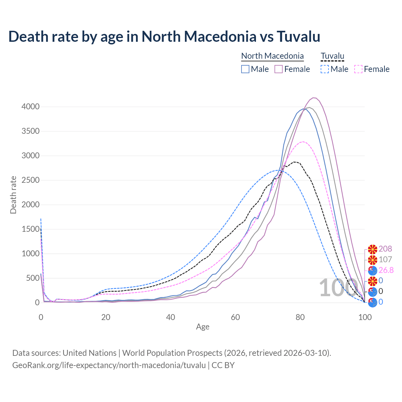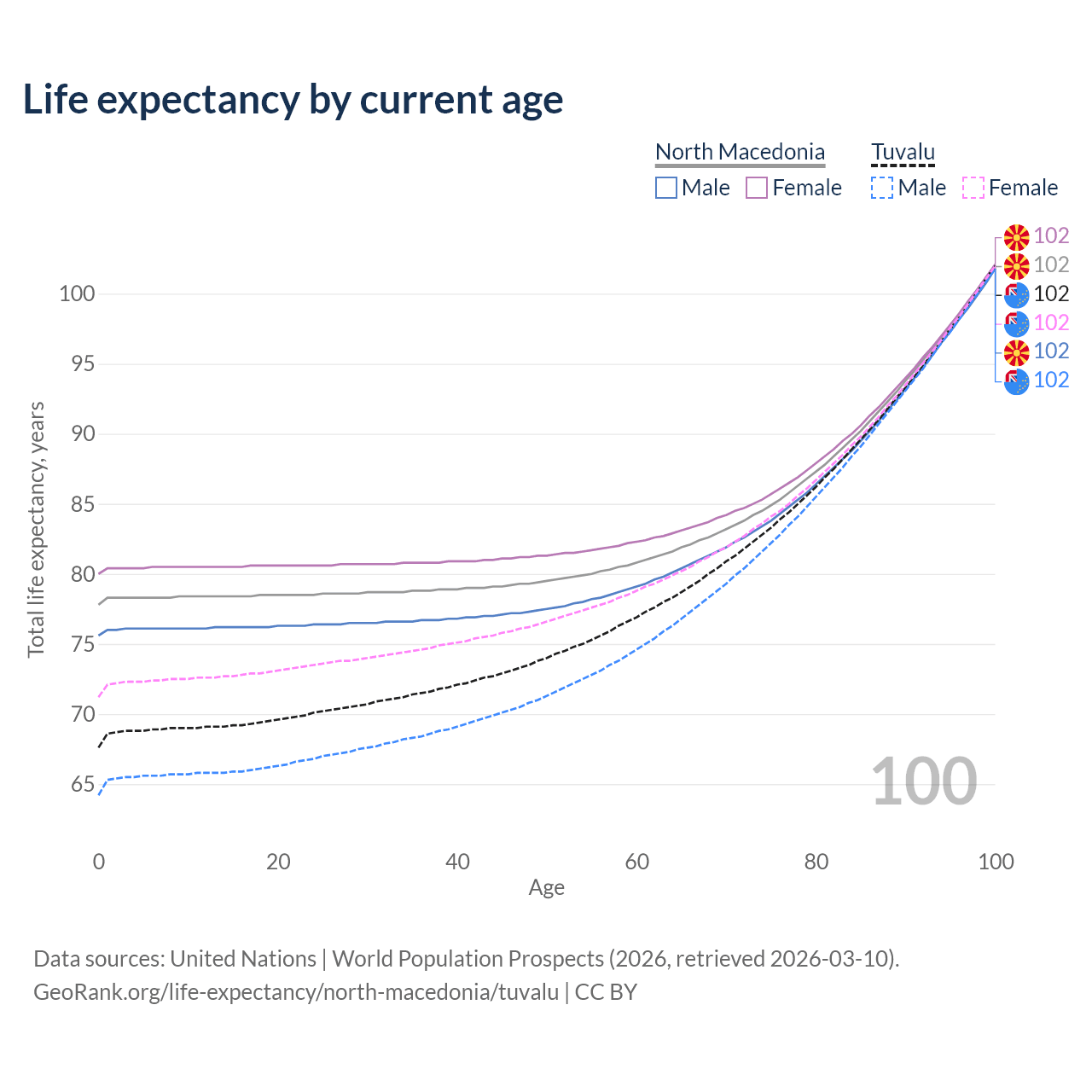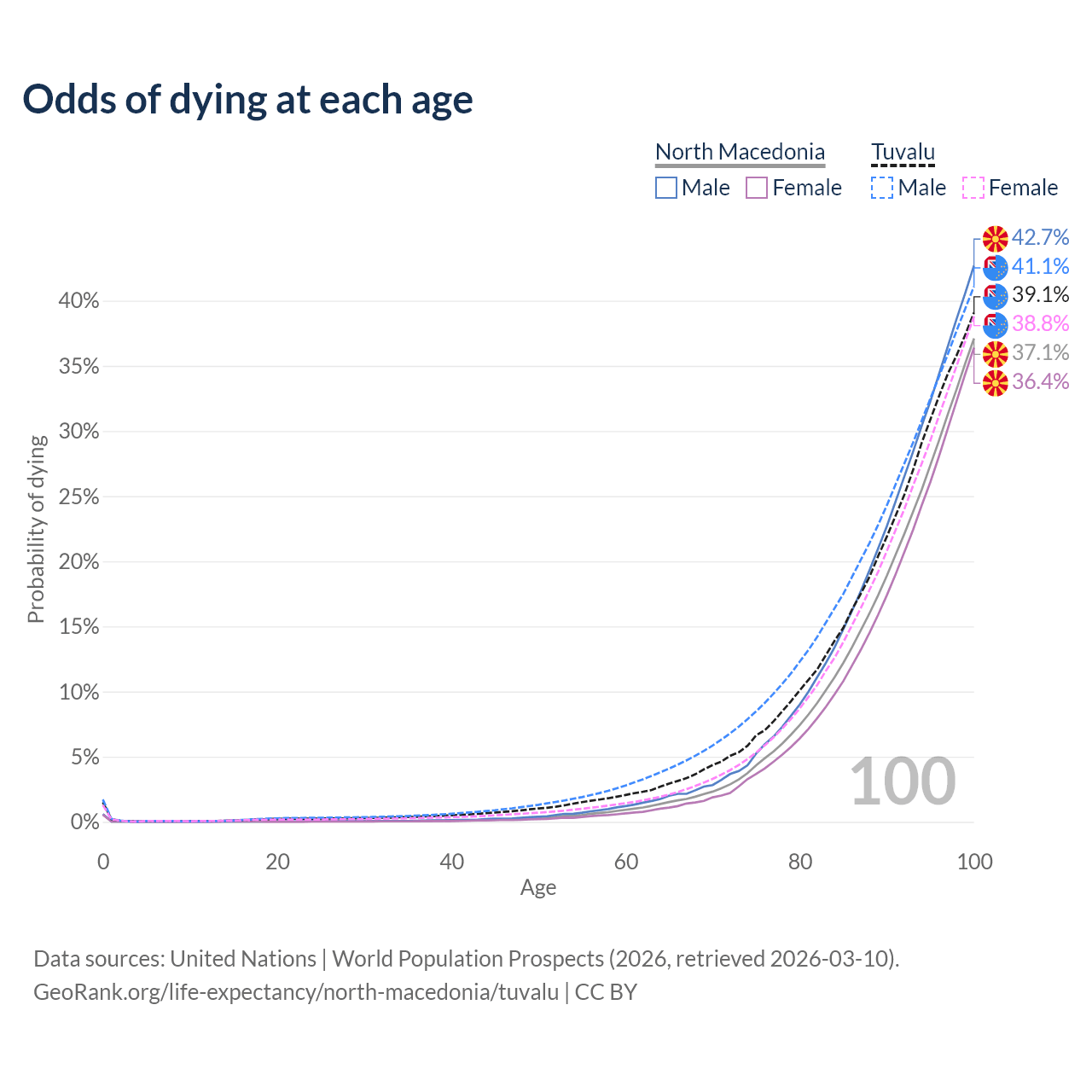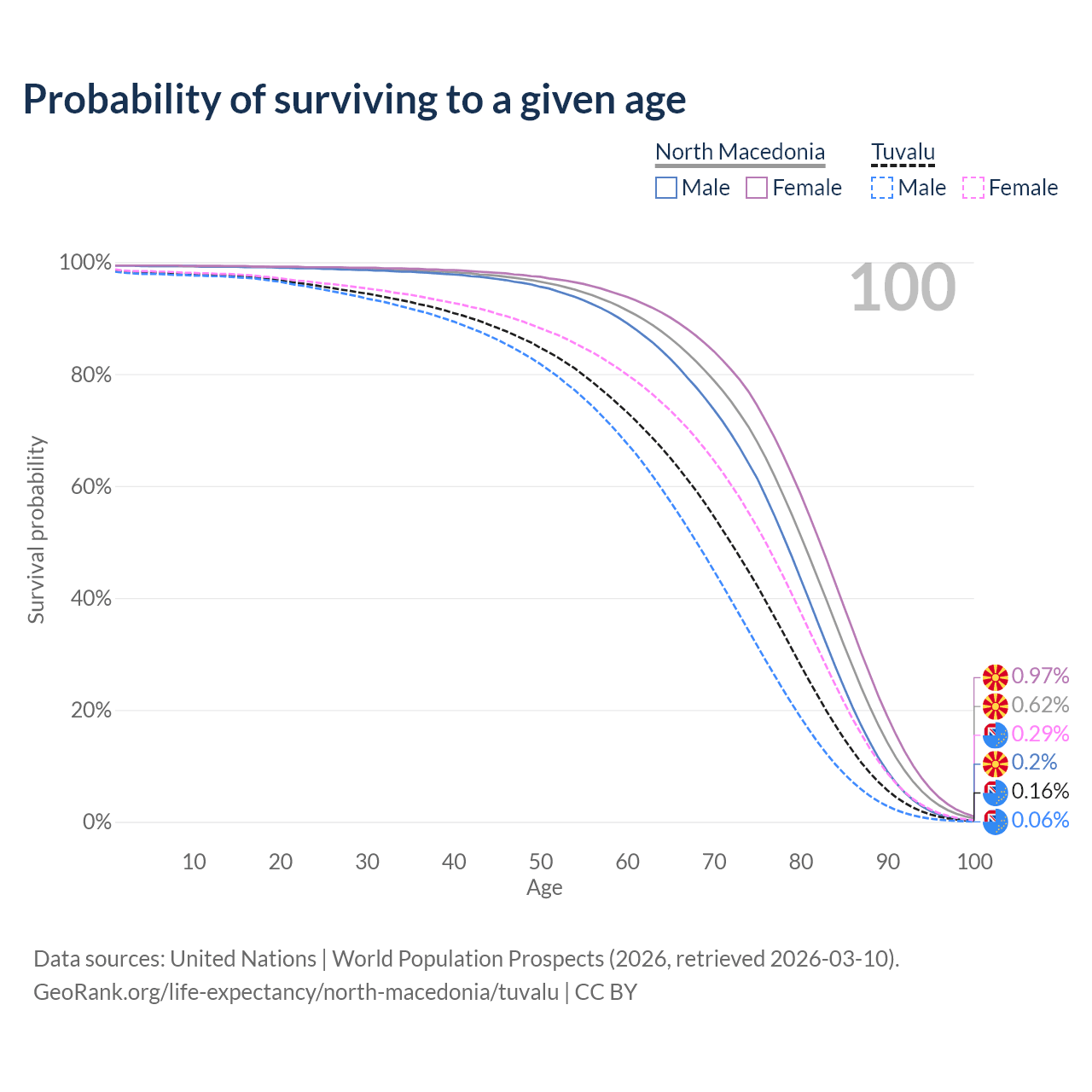 This life expectancy calculator shows the odds of living to 100, 95, 90, and below based on current age for both males and females in North Macedonia and Tuvalu, along with mean and median age of death. The calculations are based on the 2026 life tables (actuarial tables) from the UN World Population Prospects.