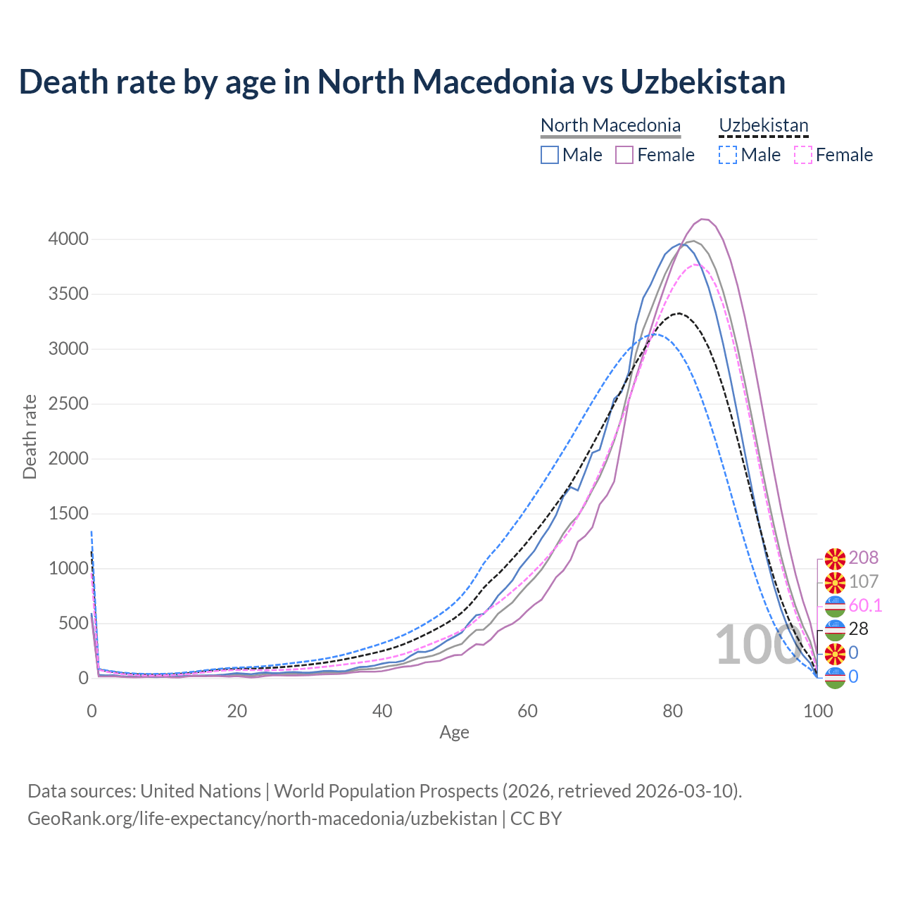 This life expectancy calculator shows the odds of living to 100, 95, 90, and below based on current age for both males and females in North Macedonia and Uzbekistan, along with mean and median age of death. The calculations are based on the 2026 life tables (actuarial tables) from the UN World Population Prospects.