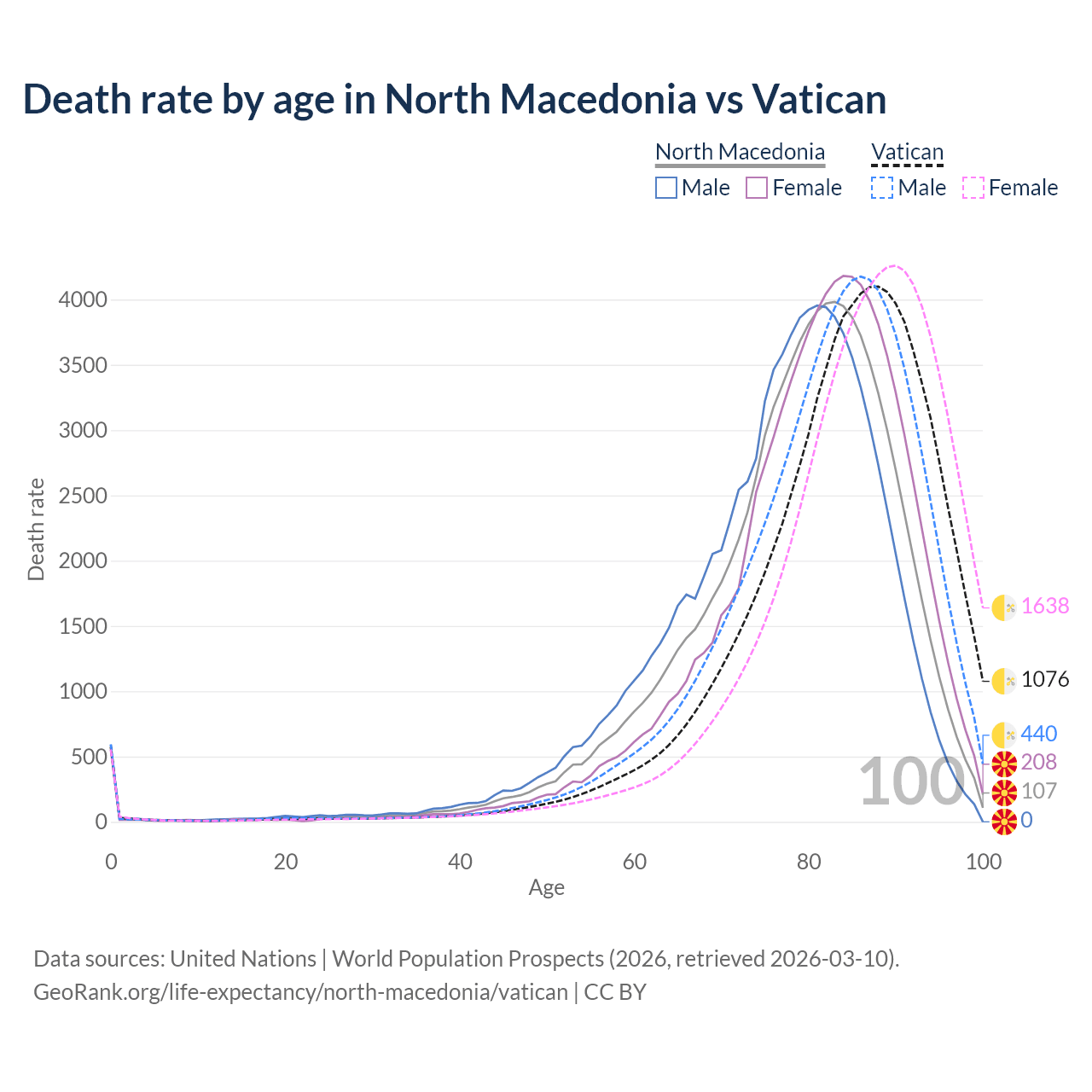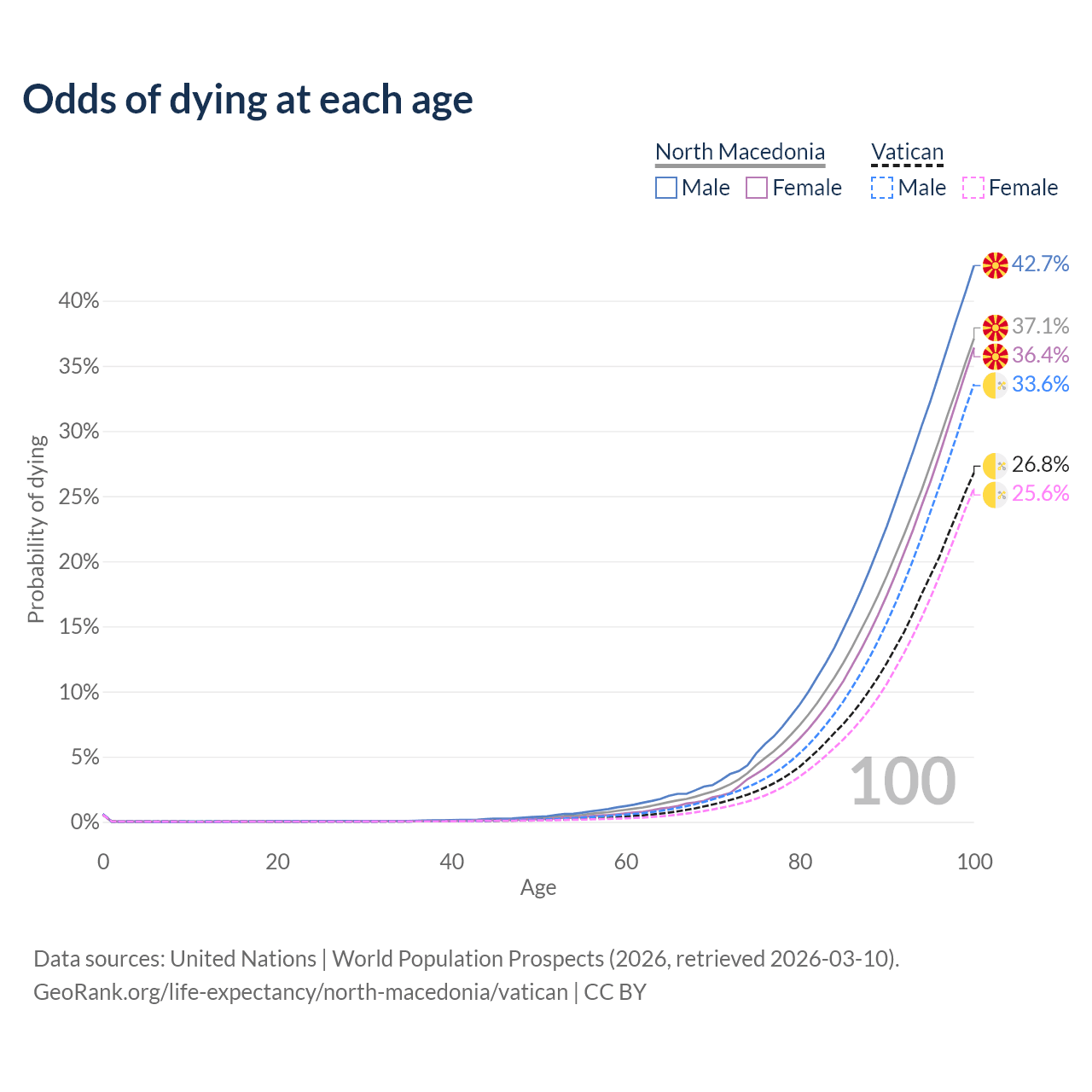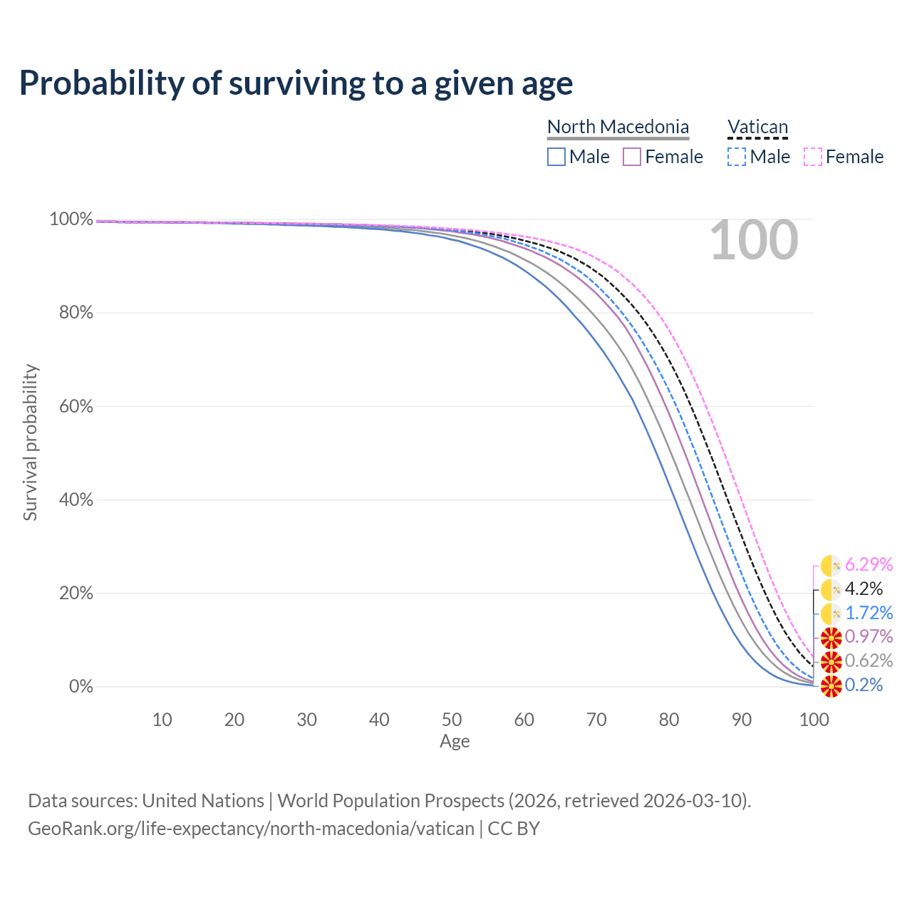 This life expectancy calculator shows the odds of living to 100, 95, 90, and below based on current age for both males and females in North Macedonia and the Vatican, along with mean and median age of death. The calculations are based on the 2026 life tables (actuarial tables) from the UN World Population Prospects.