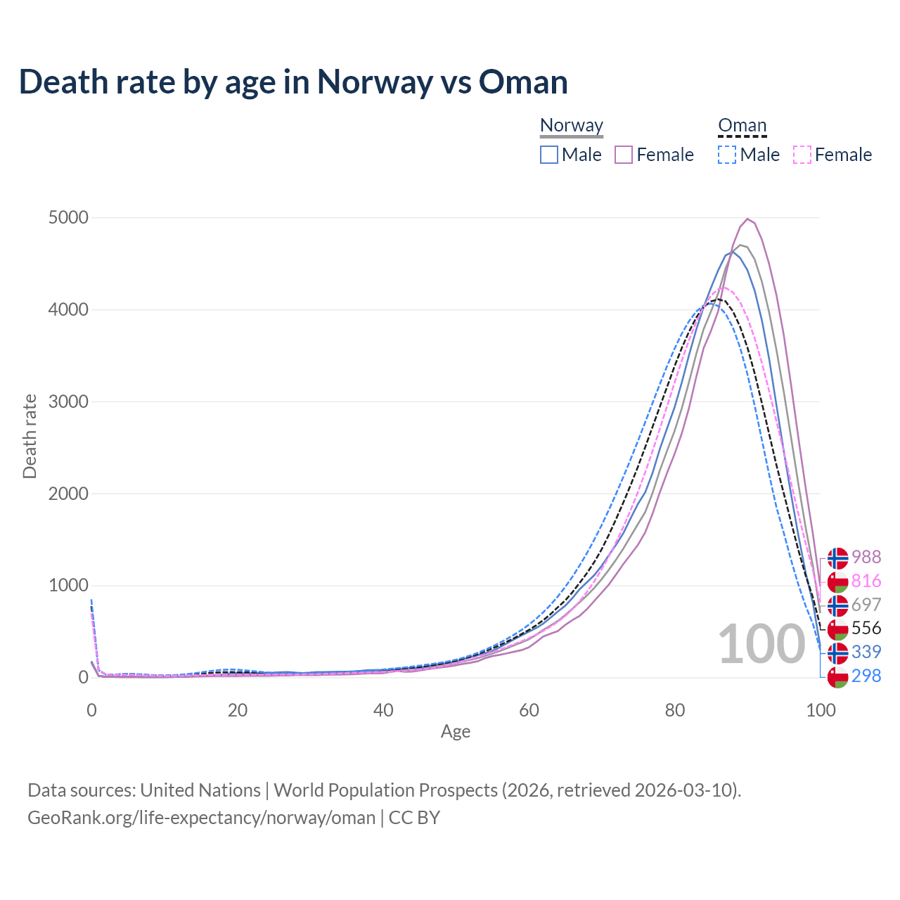 In Norway, the most common age of death is 89, compared to 86 in Oman. The median age of death is 86.5 in Norway and 83.5 in Oman, meaning only half of each cohort is expected to live past that age.