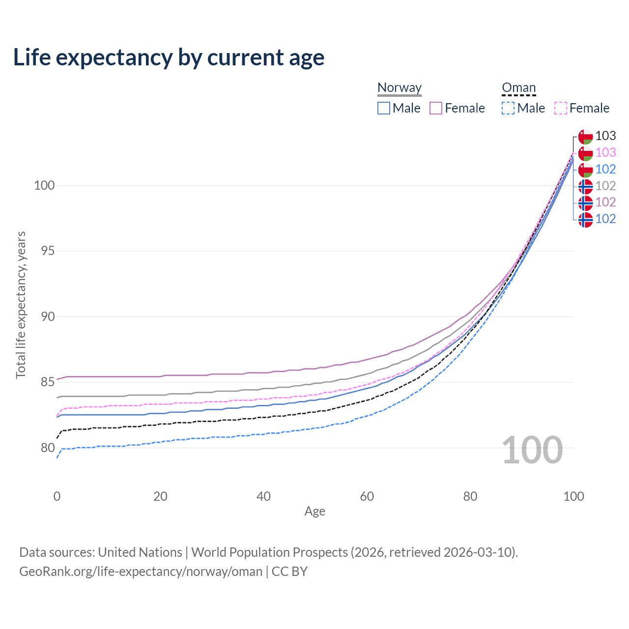 This life expectancy calculator shows the odds of living to 100, 95, 90, and below based on current age for both males and females in Norway and Oman, along with mean and median age of death. The calculations are based on the 2026 life tables (actuarial tables) from the UN World Population Prospects.