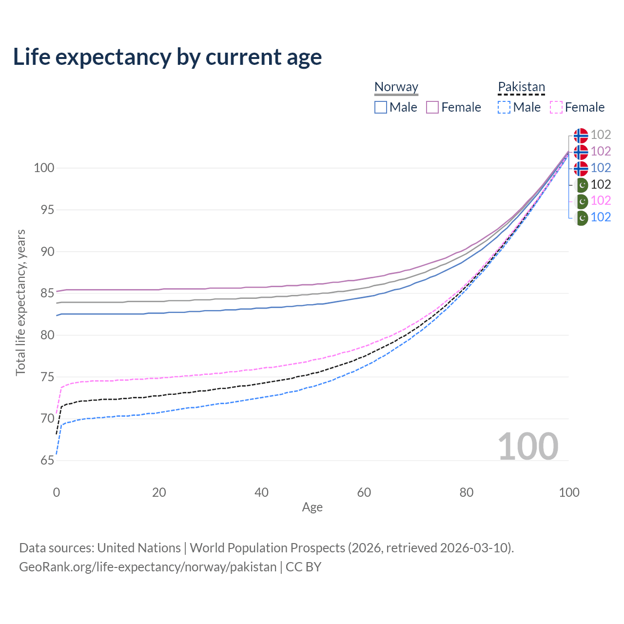 This life expectancy calculator shows the odds of living to 100, 95, 90, and below based on current age for both males and females in Norway and Pakistan, along with mean and median age of death. The calculations are based on the 2026 life tables (actuarial tables) from the UN World Population Prospects.