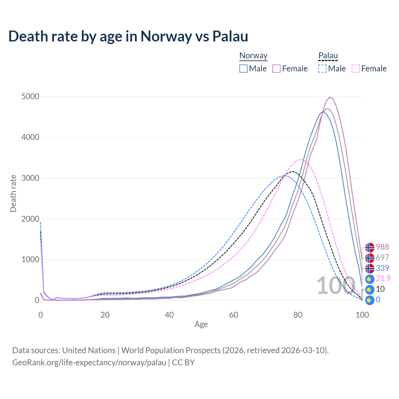 In Norway, the most common age of death is 89, compared to 78 in Palau. The median age of death is 86.5 in Norway and 73.8 in Palau, meaning only half of each cohort is expected to live past that age.