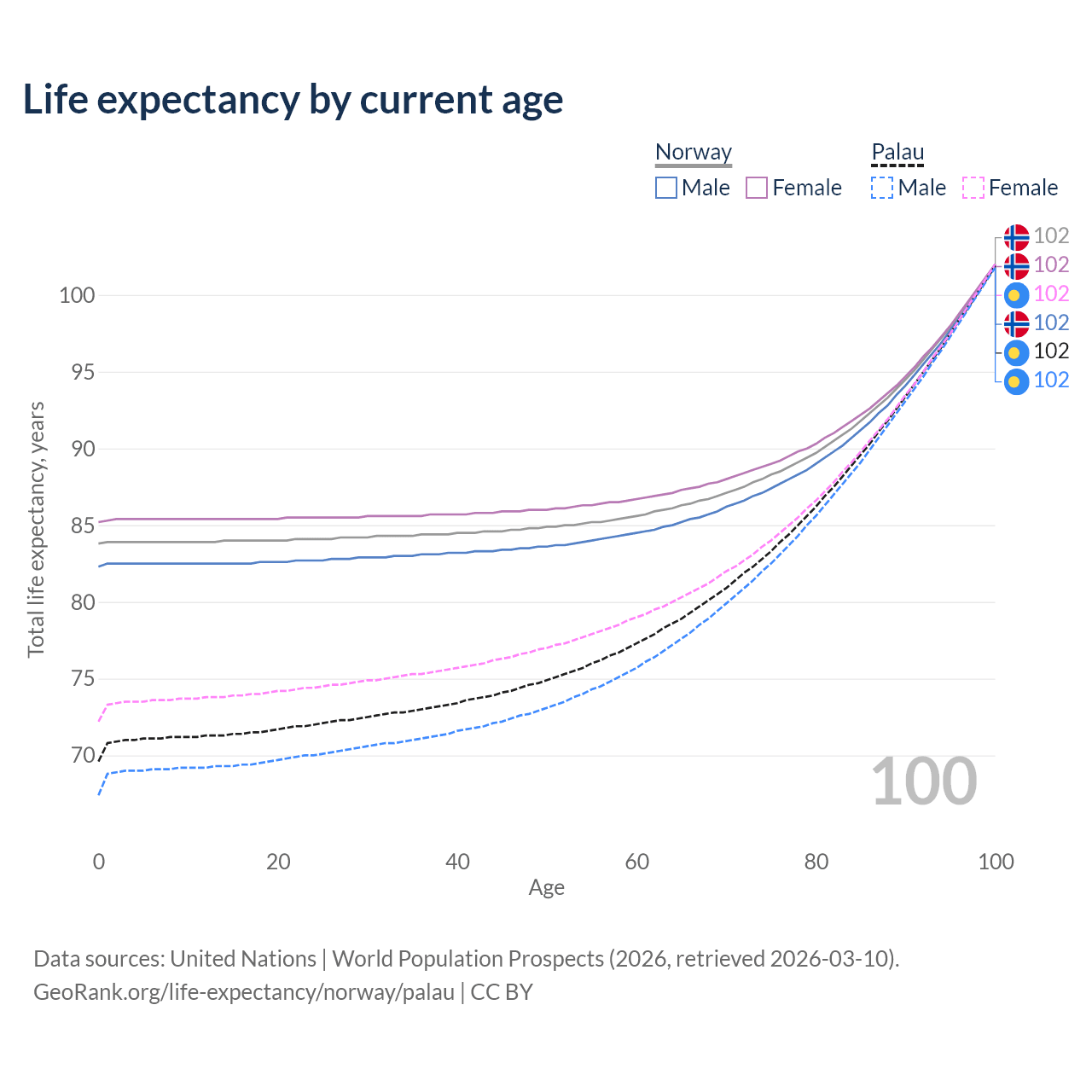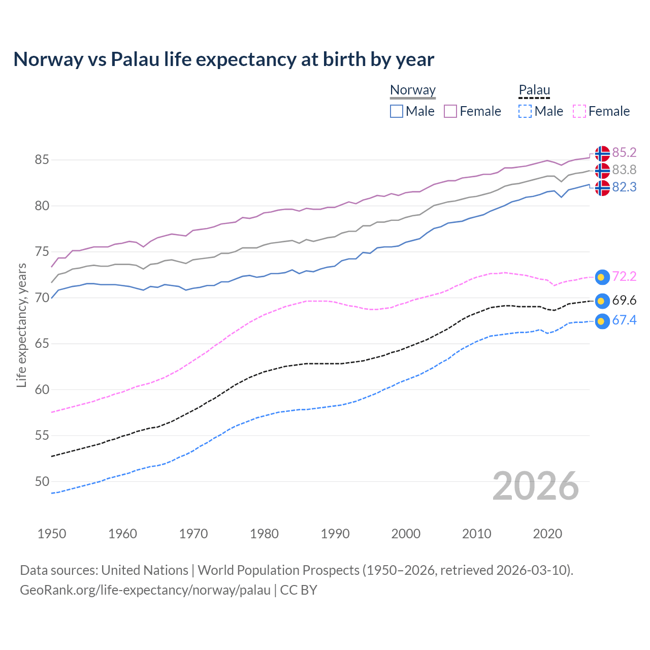 The average life expectancy at birth is 83.8 years in Norway vs 69.6 in Palau. Norway is ranked 13/197 by life expectancy, and Palau is 140/197. In Norway, the life expectancy is 82.3 years for males and 85.2 years for females. In Palau, it's 67.4 years for males and 72.2 years for females.