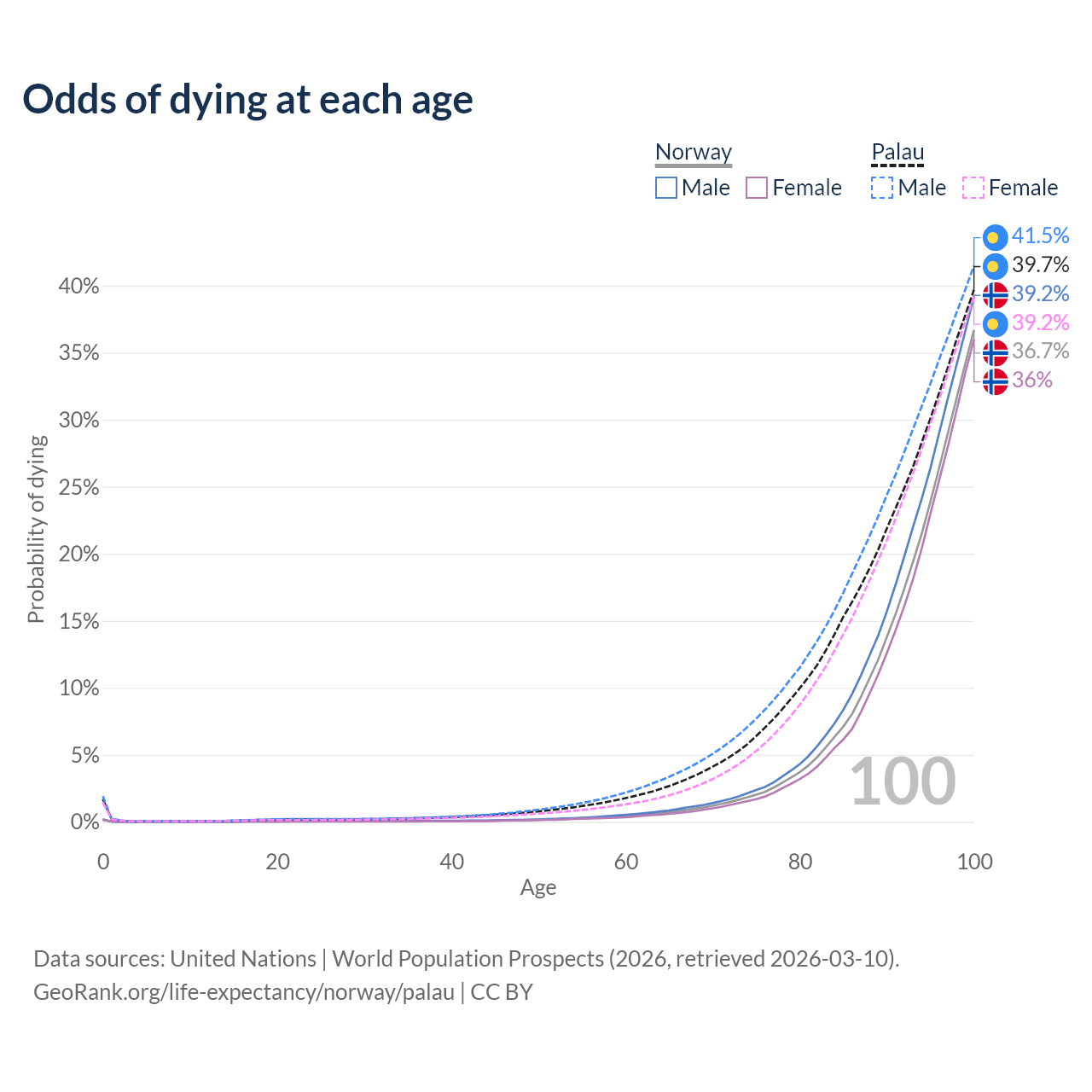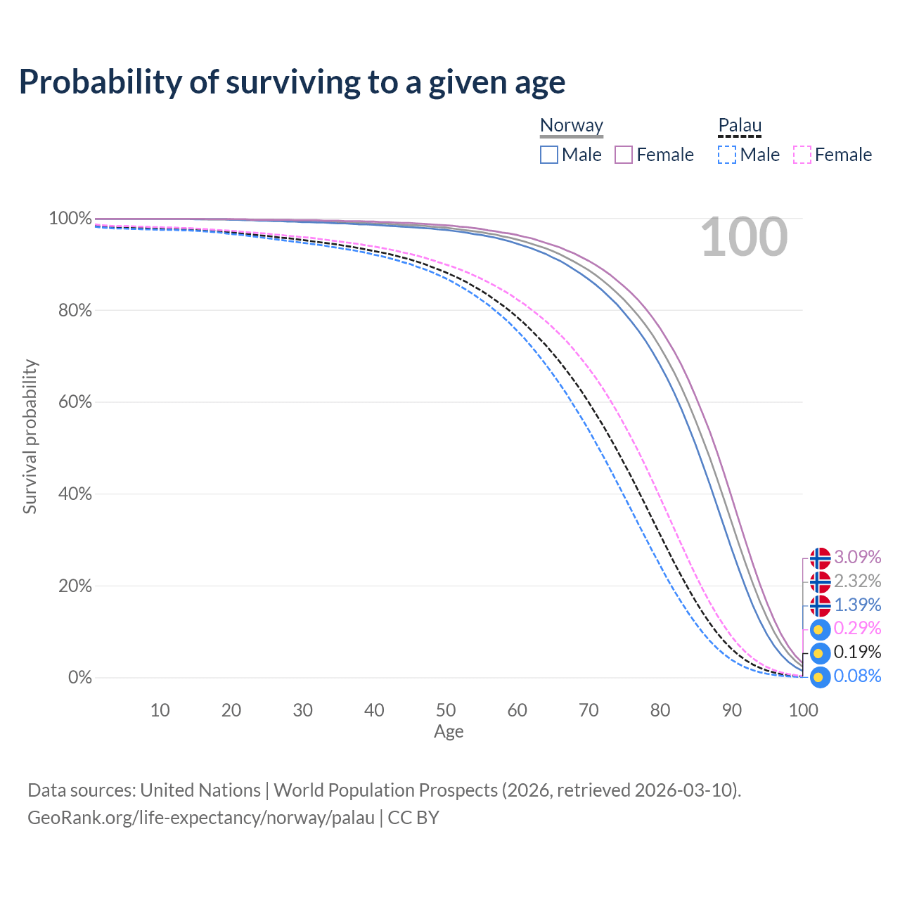 This life expectancy calculator shows the odds of living to 100, 95, 90, and below based on current age for both males and females in Norway and Palau, along with mean and median age of death. The calculations are based on the 2026 life tables (actuarial tables) from the UN World Population Prospects.