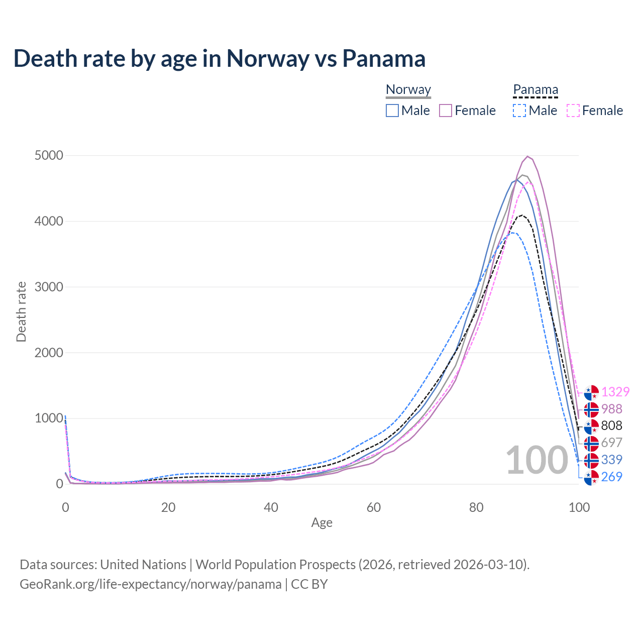 In Norway, the most common age of death is 89, compared to 89 in Panama. The median age of death is 86.5 in Norway and 84.6 in Panama, meaning only half of each cohort is expected to live past that age.