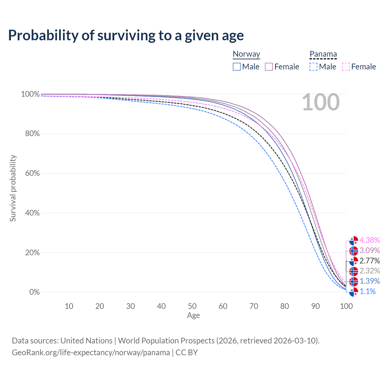 This life expectancy calculator shows the odds of living to 100, 95, 90, and below based on current age for both males and females in Norway and Panama, along with mean and median age of death. The calculations are based on the 2026 life tables (actuarial tables) from the UN World Population Prospects.