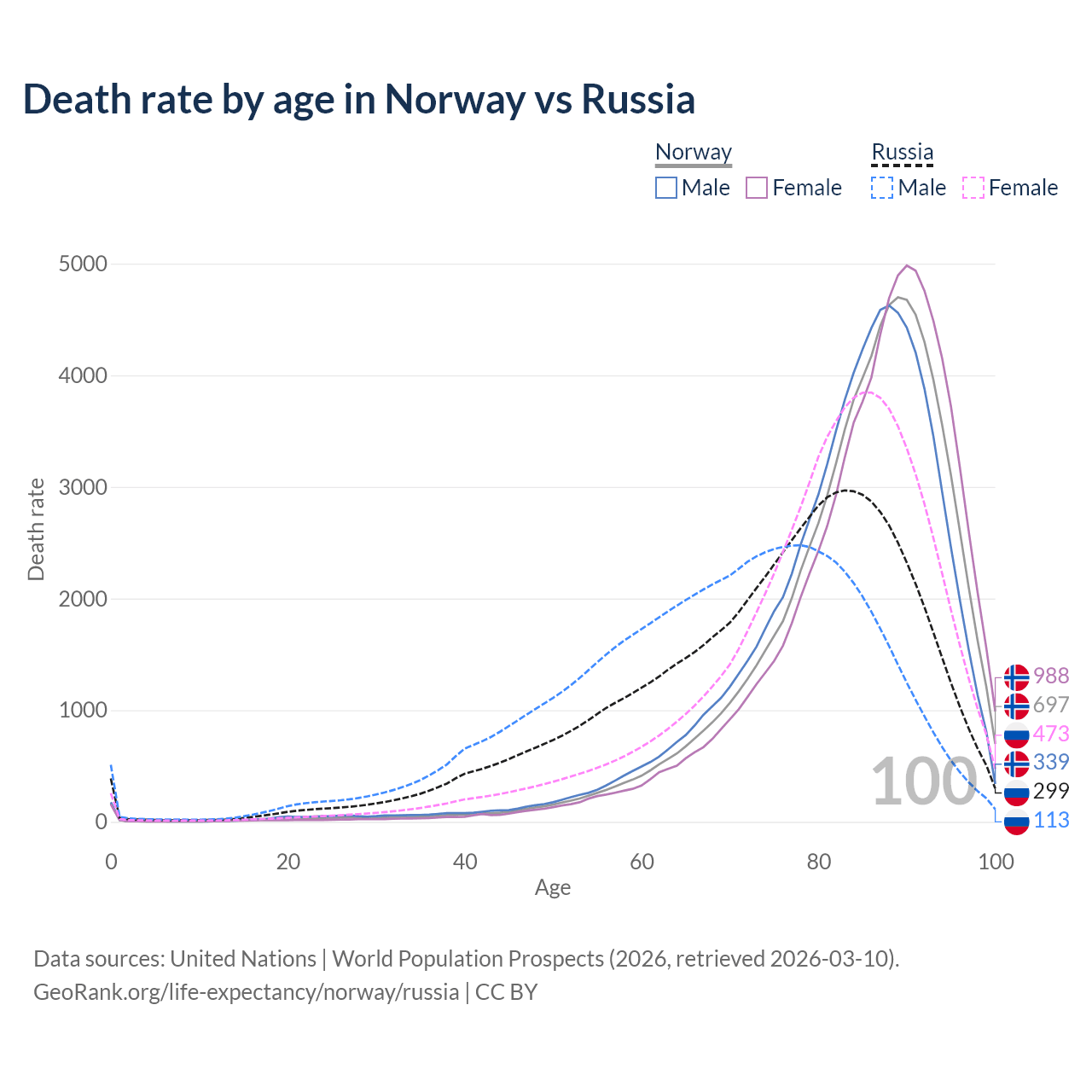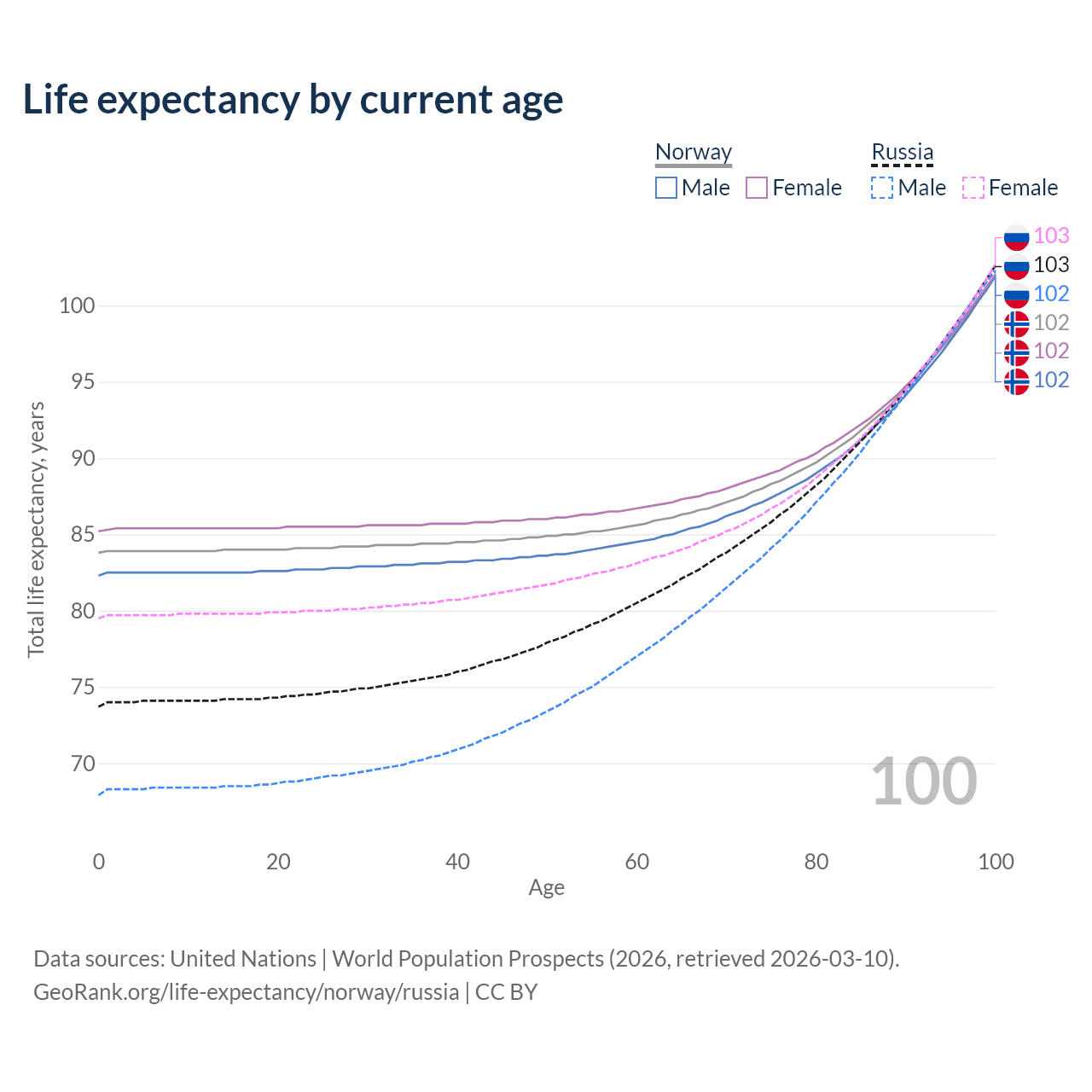 This life expectancy calculator shows the odds of living to 100, 95, 90, and below based on current age for both males and females in Norway and Russia, along with mean and median age of death. The calculations are based on the 2026 life tables (actuarial tables) from the UN World Population Prospects.