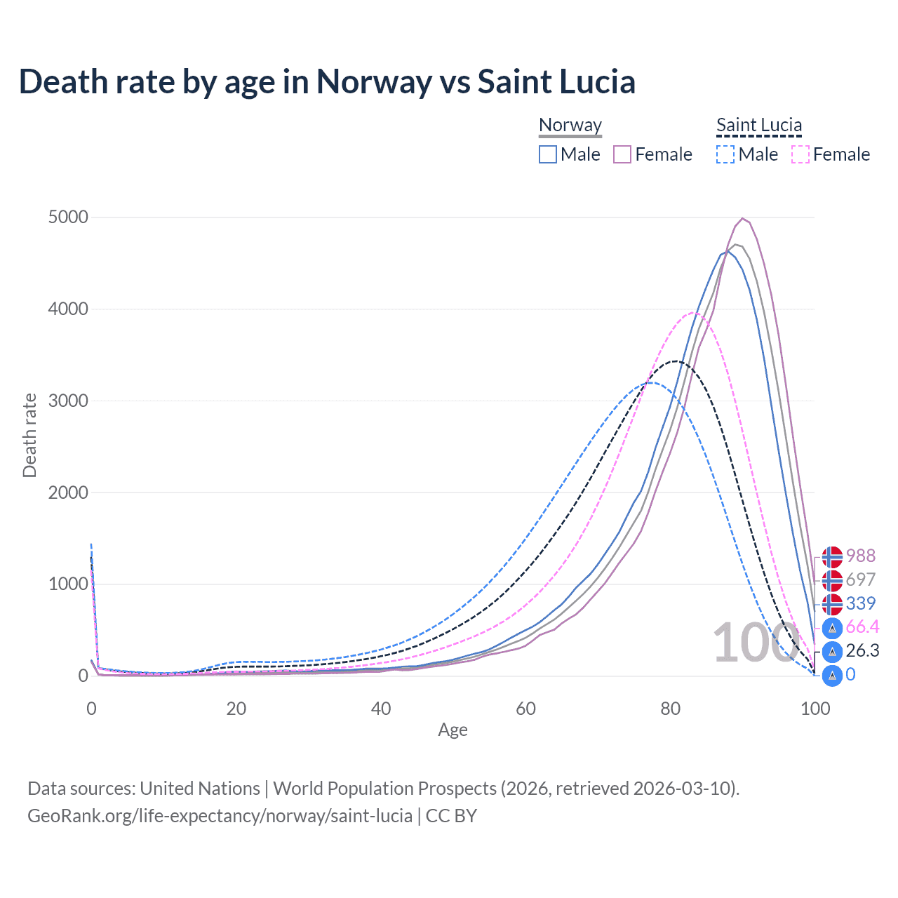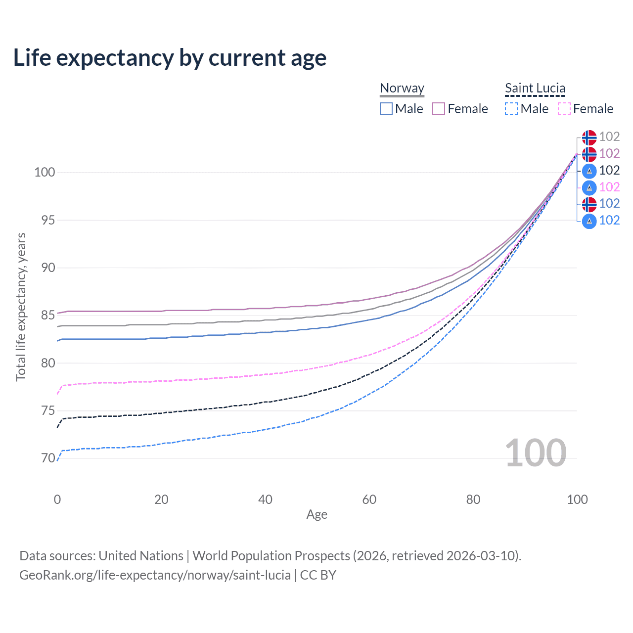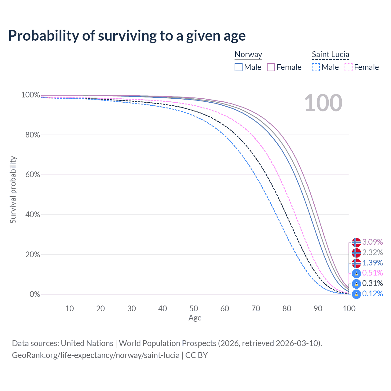 This life expectancy calculator shows the odds of living to 100, 95, 90, and below based on current age for both males and females in Norway and Saint Lucia, along with mean and median age of death. The calculations are based on the 2026 life tables (actuarial tables) from the UN World Population Prospects.
