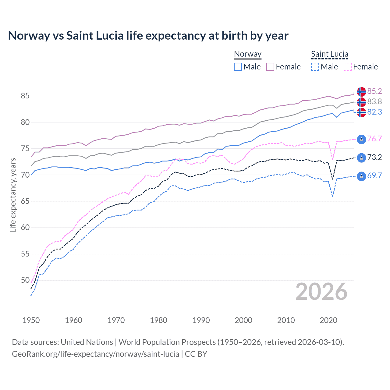 GeoRank.org/life-expectancy/norway/saint-lucia | CC BY