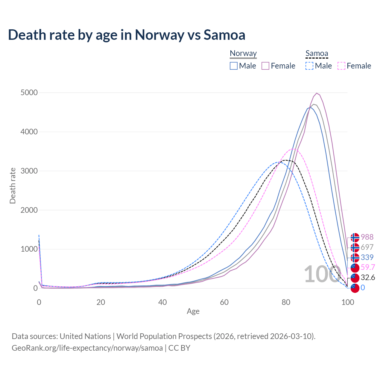 In Norway, the most common age of death is 89, compared to 80 in Samoa. The median age of death is 86.5 in Norway and 75.9 in Samoa, meaning only half of each cohort is expected to live past that age.