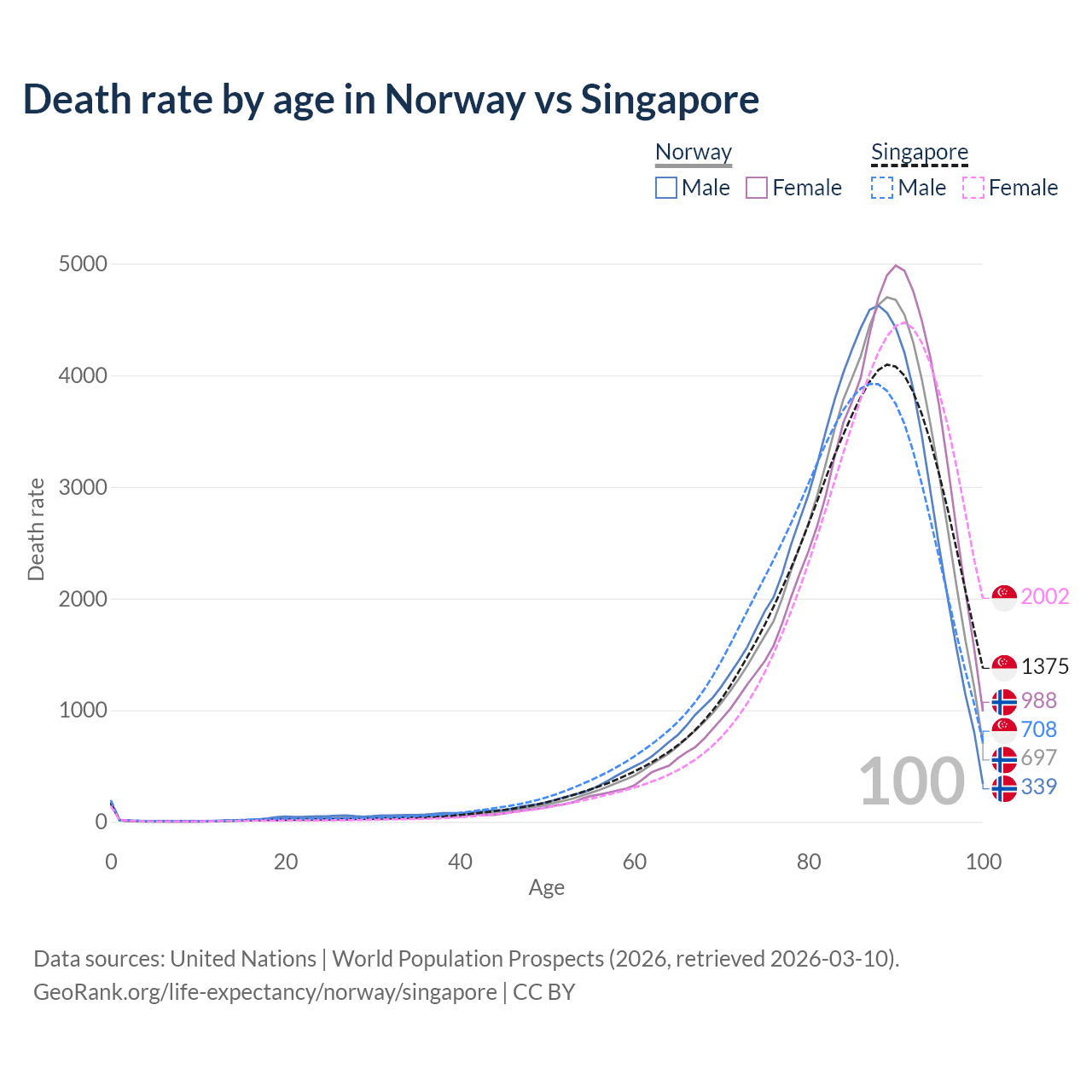 This life expectancy calculator shows the odds of living to 100, 95, 90, and below based on current age for both males and females in Norway and Singapore, along with mean and median age of death. The calculations are based on the 2026 life tables (actuarial tables) from the UN World Population Prospects.