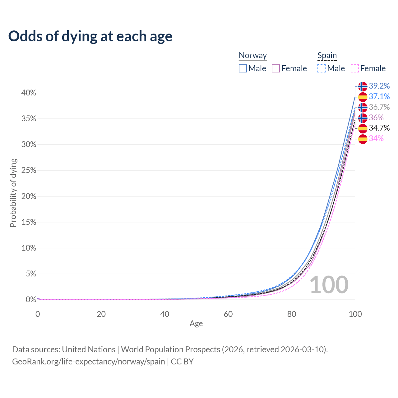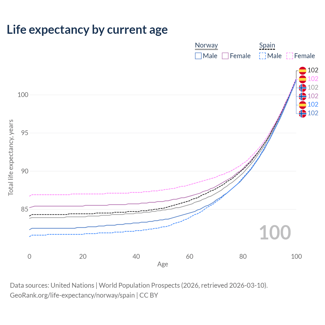 This life expectancy calculator shows the odds of living to 100, 95, 90, and below based on current age for both males and females in Norway and Spain, along with mean and median age of death. The calculations are based on the 2026 life tables (actuarial tables) from the UN World Population Prospects.