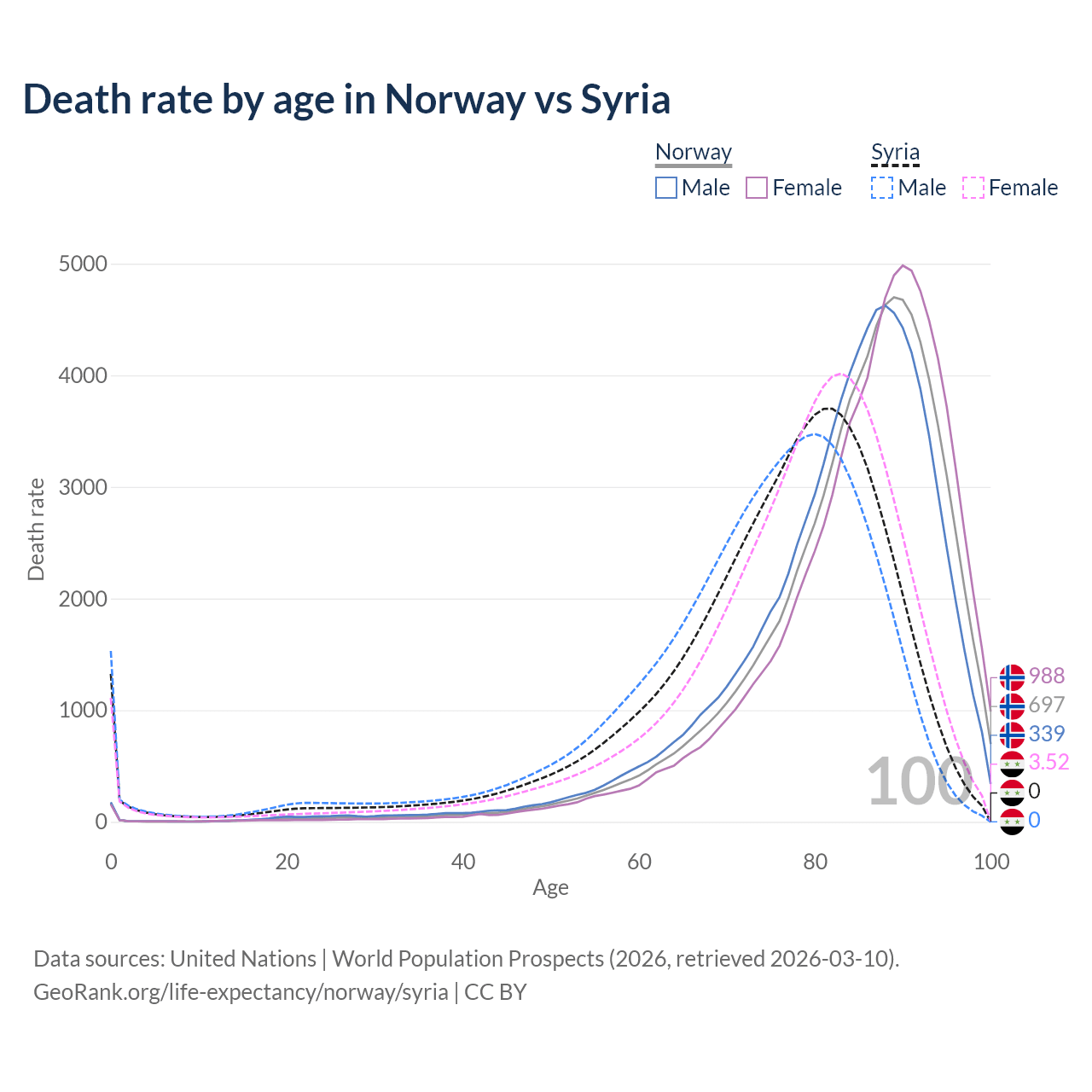 In Norway, the most common age of death is 89, compared to 82 in Syria. The median age of death is 86.5 in Norway and 77.7 in Syria, meaning only half of each cohort is expected to live past that age.