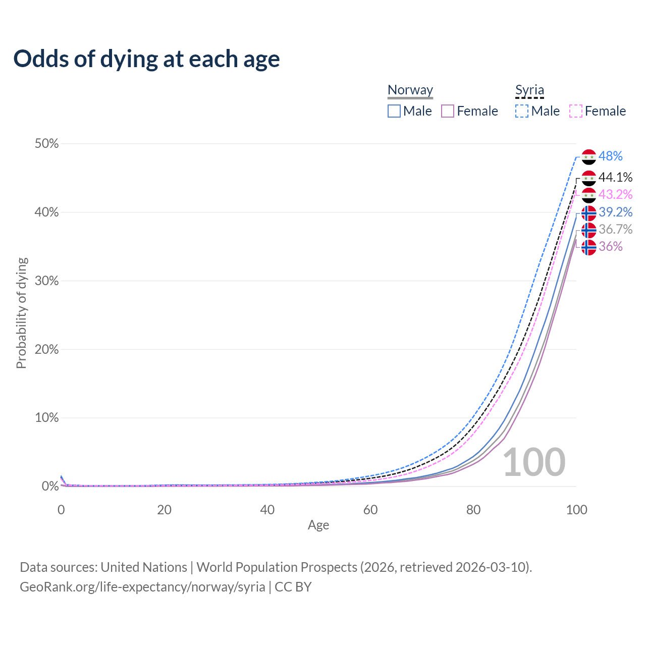 This life expectancy calculator shows the odds of living to 100, 95, 90, and below based on current age for both males and females in Norway and Syria, along with mean and median age of death. The calculations are based on the 2026 life tables (actuarial tables) from the UN World Population Prospects.