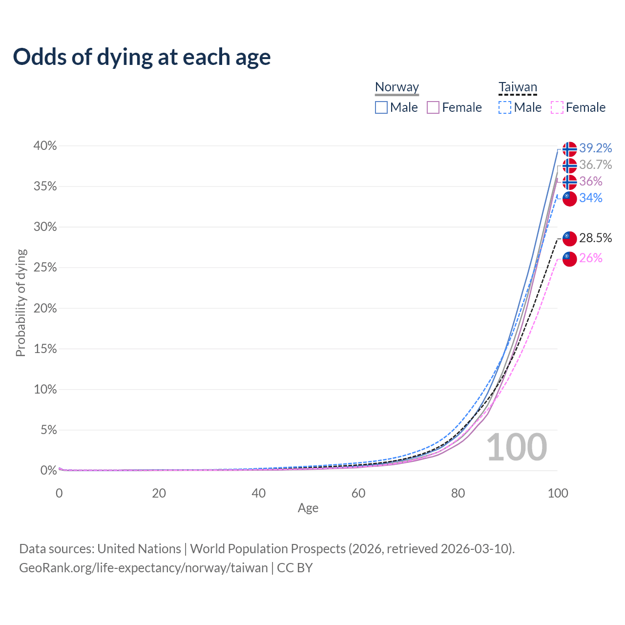 This life expectancy calculator shows the odds of living to 100, 95, 90, and below based on current age for both males and females in Norway and Taiwan, along with mean and median age of death. The calculations are based on the 2026 life tables (actuarial tables) from the UN World Population Prospects.