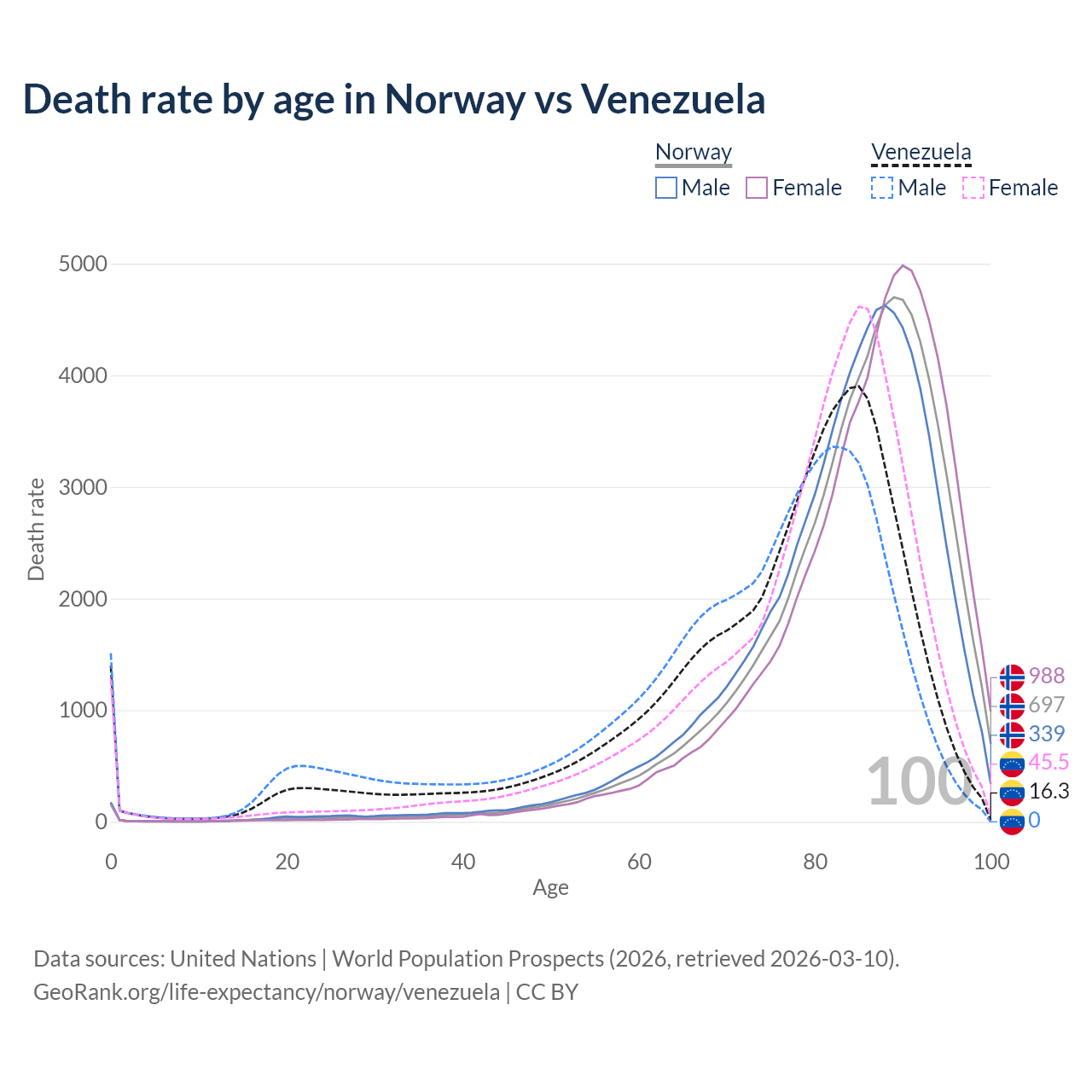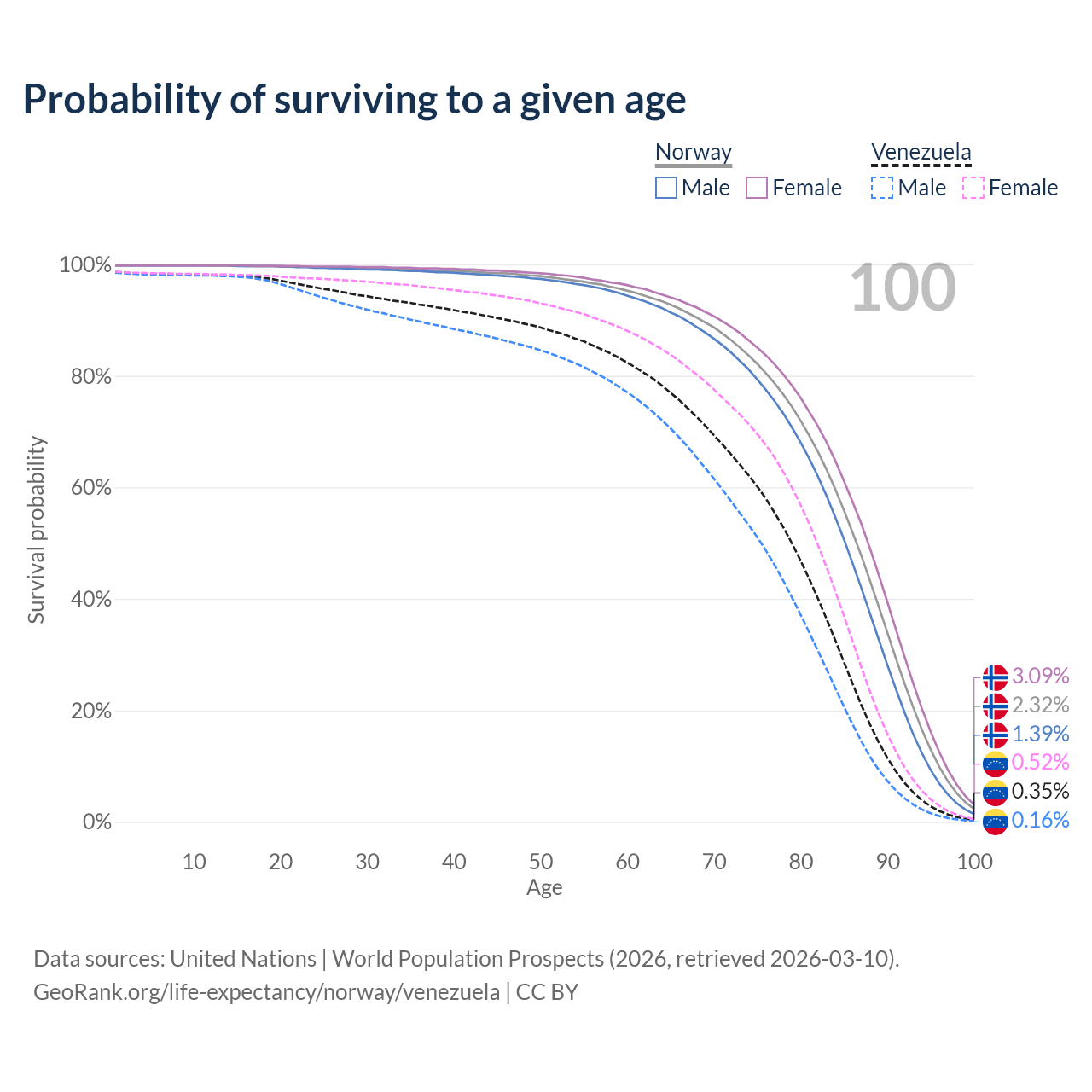 This life expectancy calculator shows the odds of living to 100, 95, 90, and below based on current age for both males and females in Norway and Venezuela, along with mean and median age of death. The calculations are based on the 2026 life tables (actuarial tables) from the UN World Population Prospects.