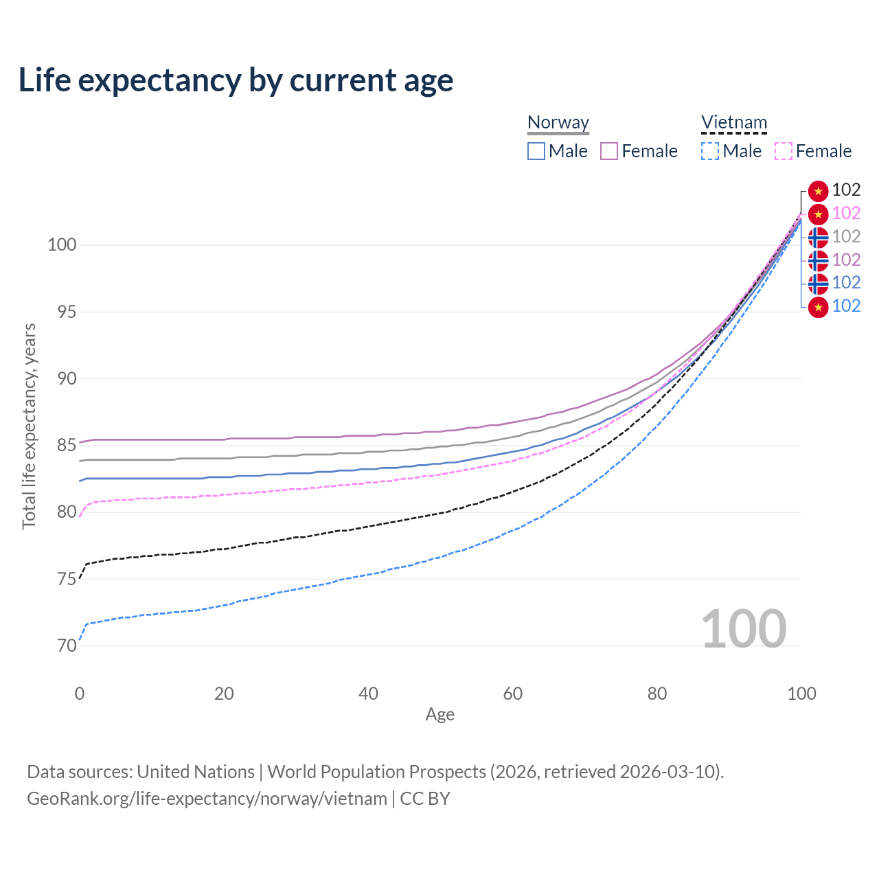 This life expectancy calculator shows the odds of living to 100, 95, 90, and below based on current age for both males and females in Norway and Vietnam, along with mean and median age of death. The calculations are based on the 2026 life tables (actuarial tables) from the UN World Population Prospects.