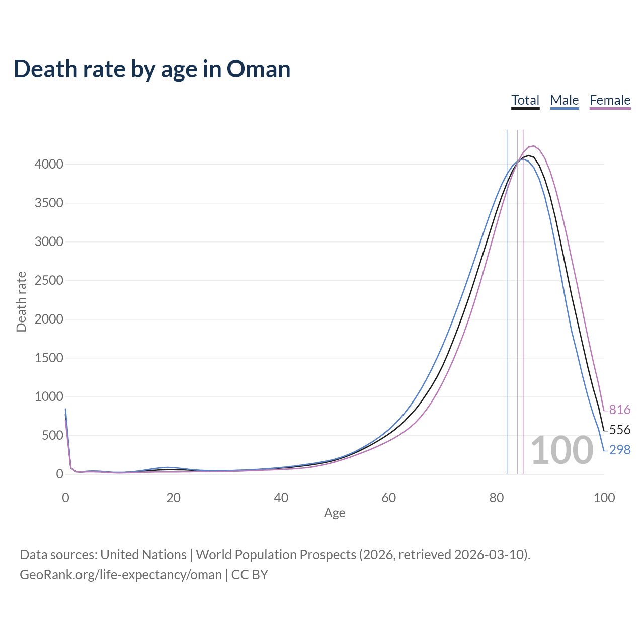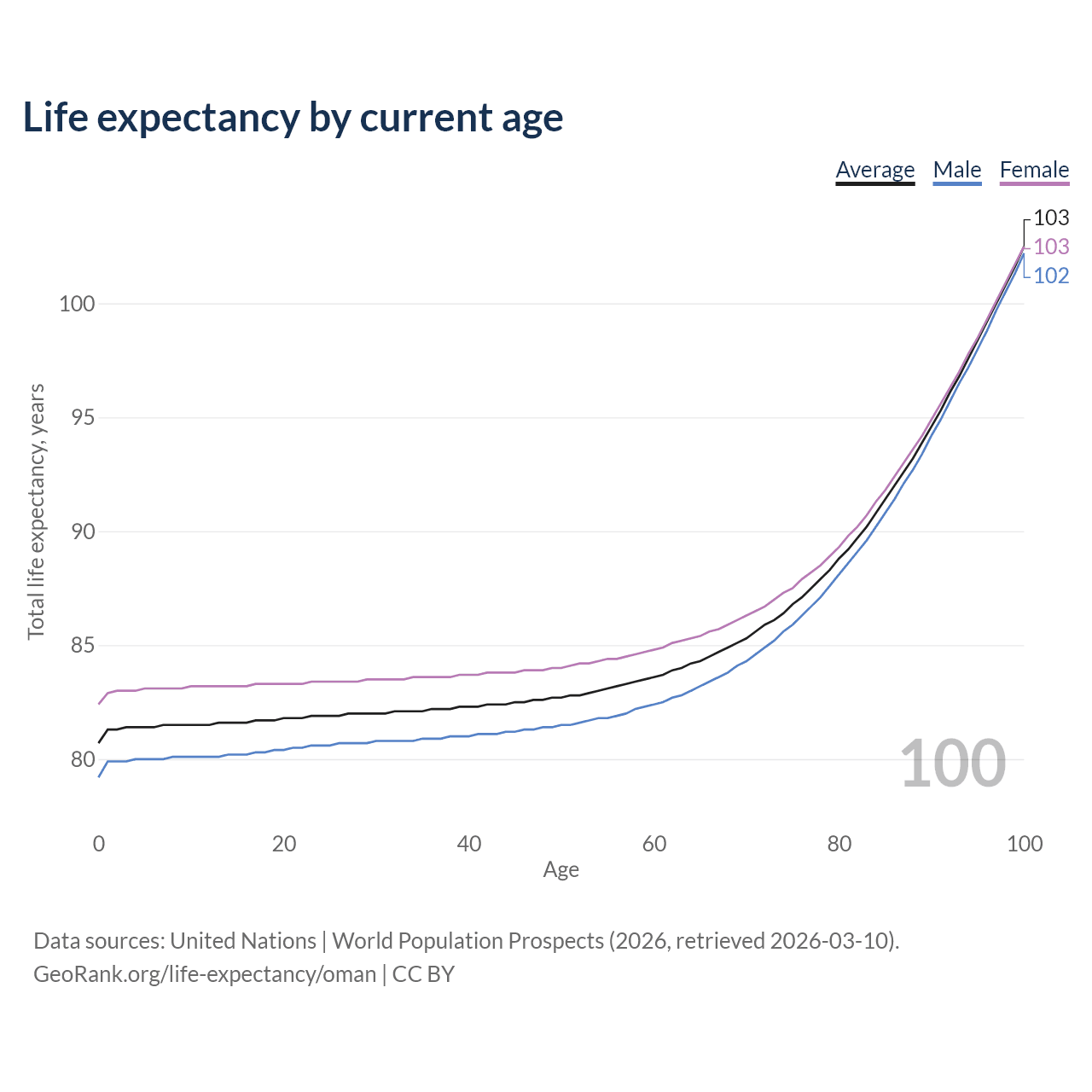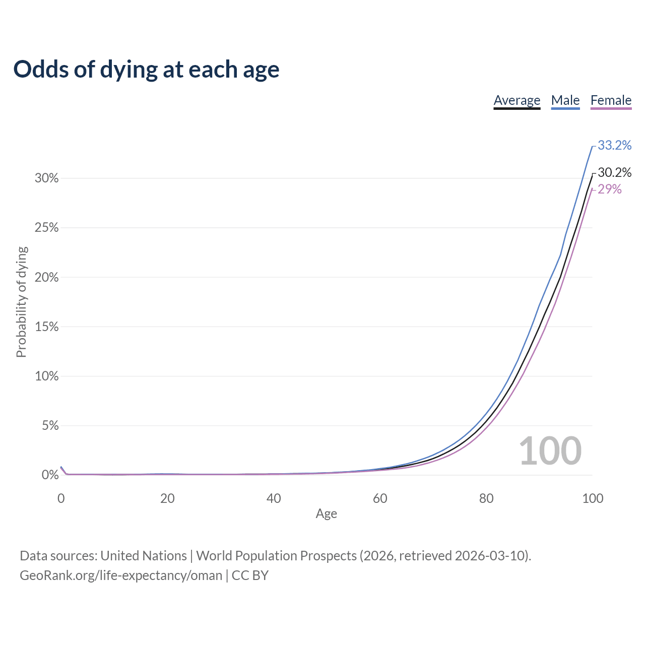 This life expectancy calculator shows the odds of living to 100, 95, 90, and below based on current age for both males and females in Oman, along with mean and median age of death. The calculations are based on the 2026 life tables (actuarial tables) from the UN World Population Prospects.