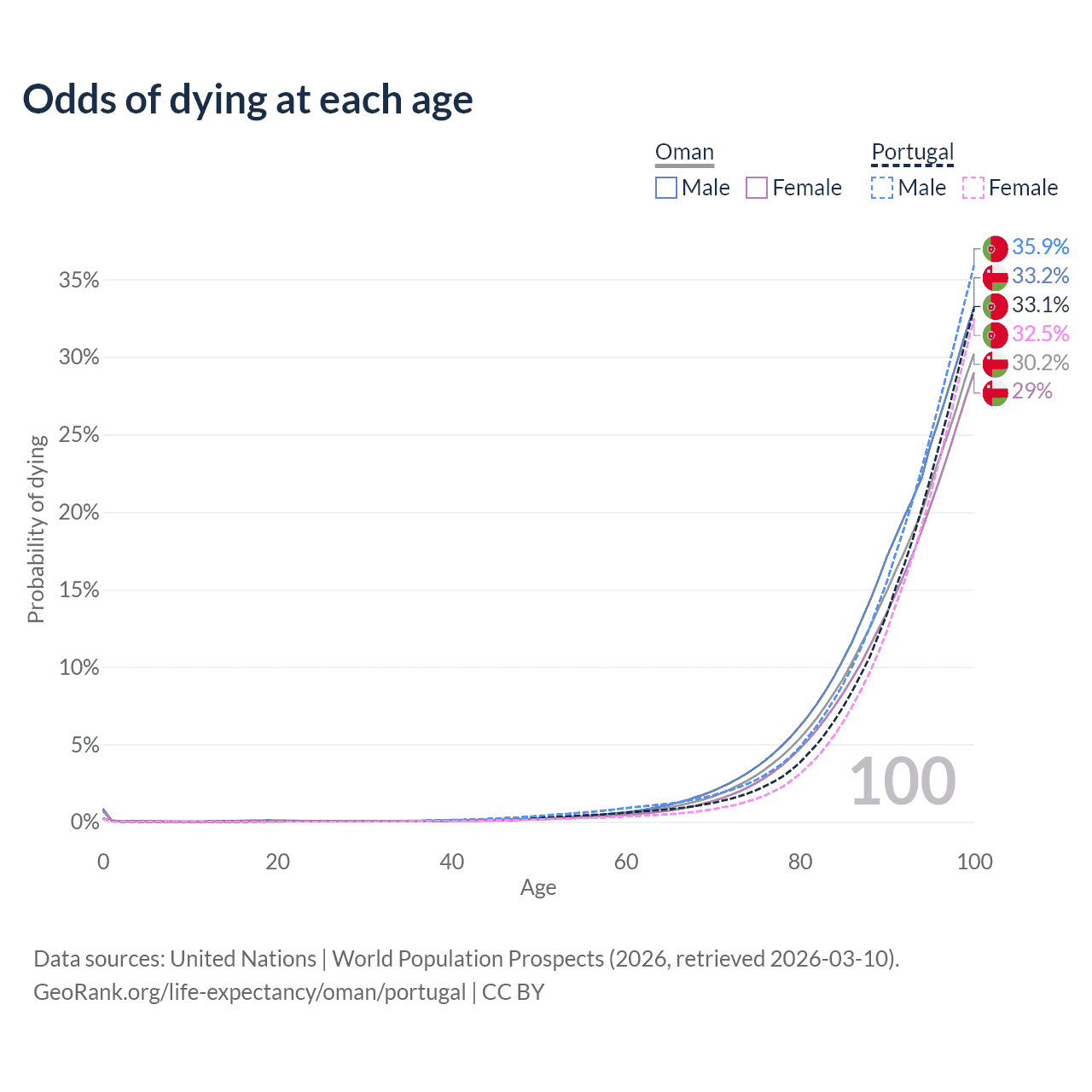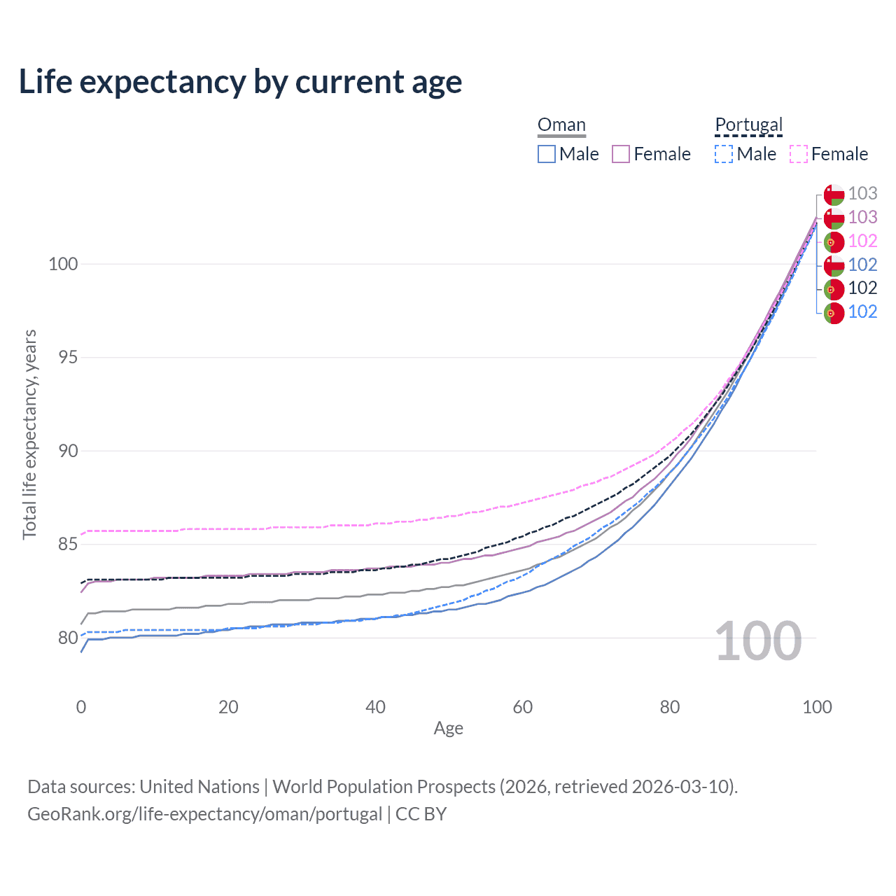 This life expectancy calculator shows the odds of living to 100, 95, 90, and below based on current age for both males and females in Oman and Portugal, along with mean and median age of death. The calculations are based on the 2026 life tables (actuarial tables) from the UN World Population Prospects.