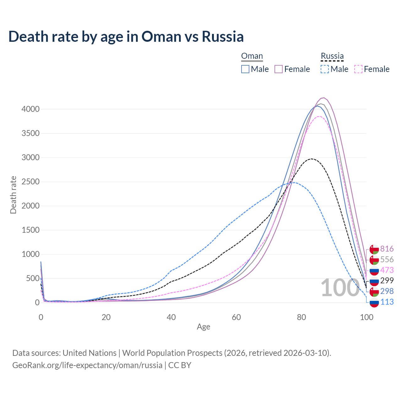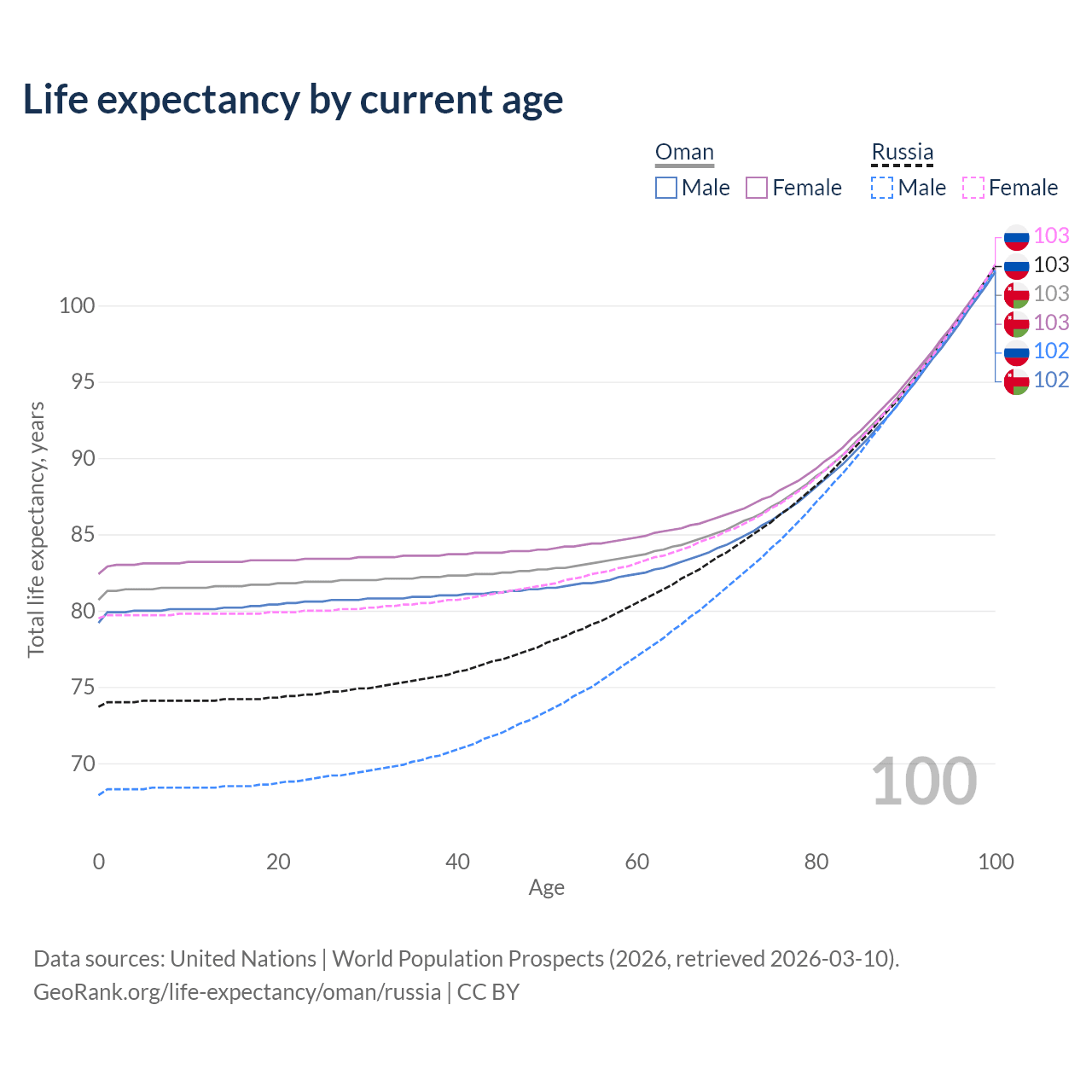 This life expectancy calculator shows the odds of living to 100, 95, 90, and below based on current age for both males and females in Oman and Russia, along with mean and median age of death. The calculations are based on the 2026 life tables (actuarial tables) from the UN World Population Prospects.