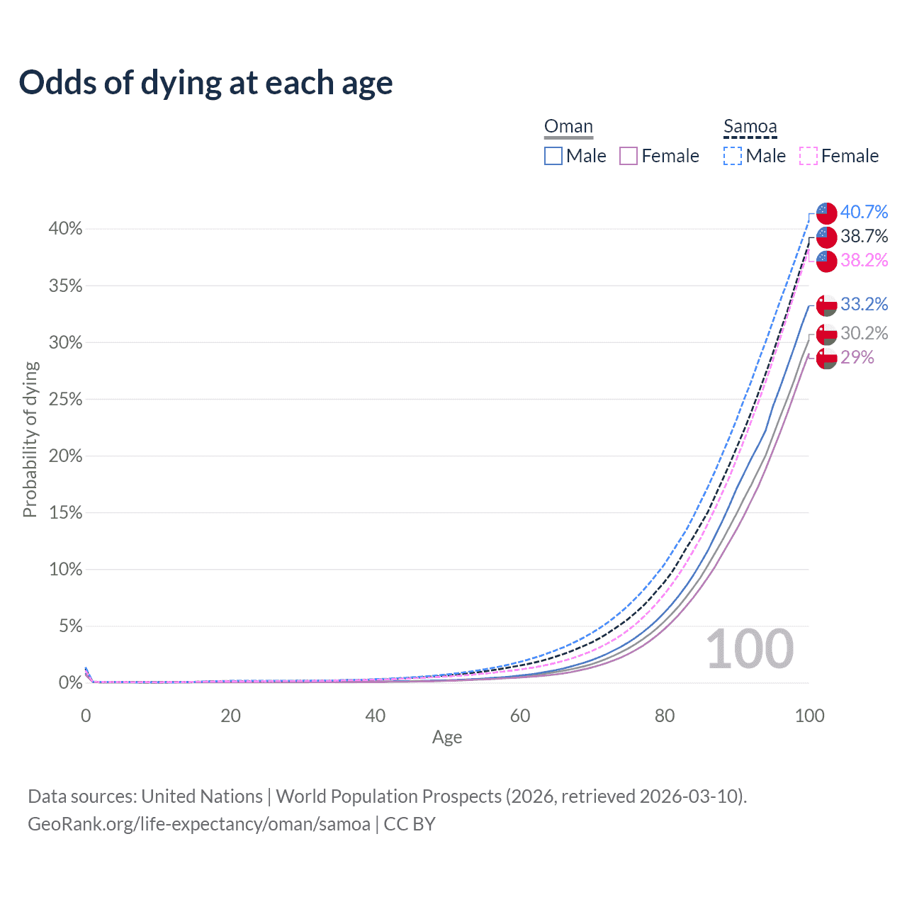 This life expectancy calculator shows the odds of living to 100, 95, 90, and below based on current age for both males and females in Oman and Samoa, along with mean and median age of death. The calculations are based on the 2026 life tables (actuarial tables) from the UN World Population Prospects.