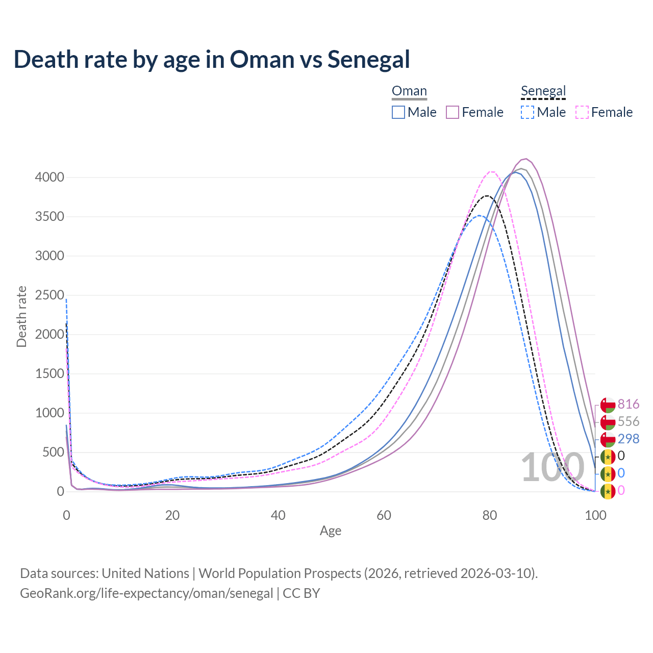 In Oman, the most common age of death is 86, compared to 80 in Senegal. The median age of death is 83.5 in Oman and 75 in Senegal, meaning only half of each cohort is expected to live past that age.