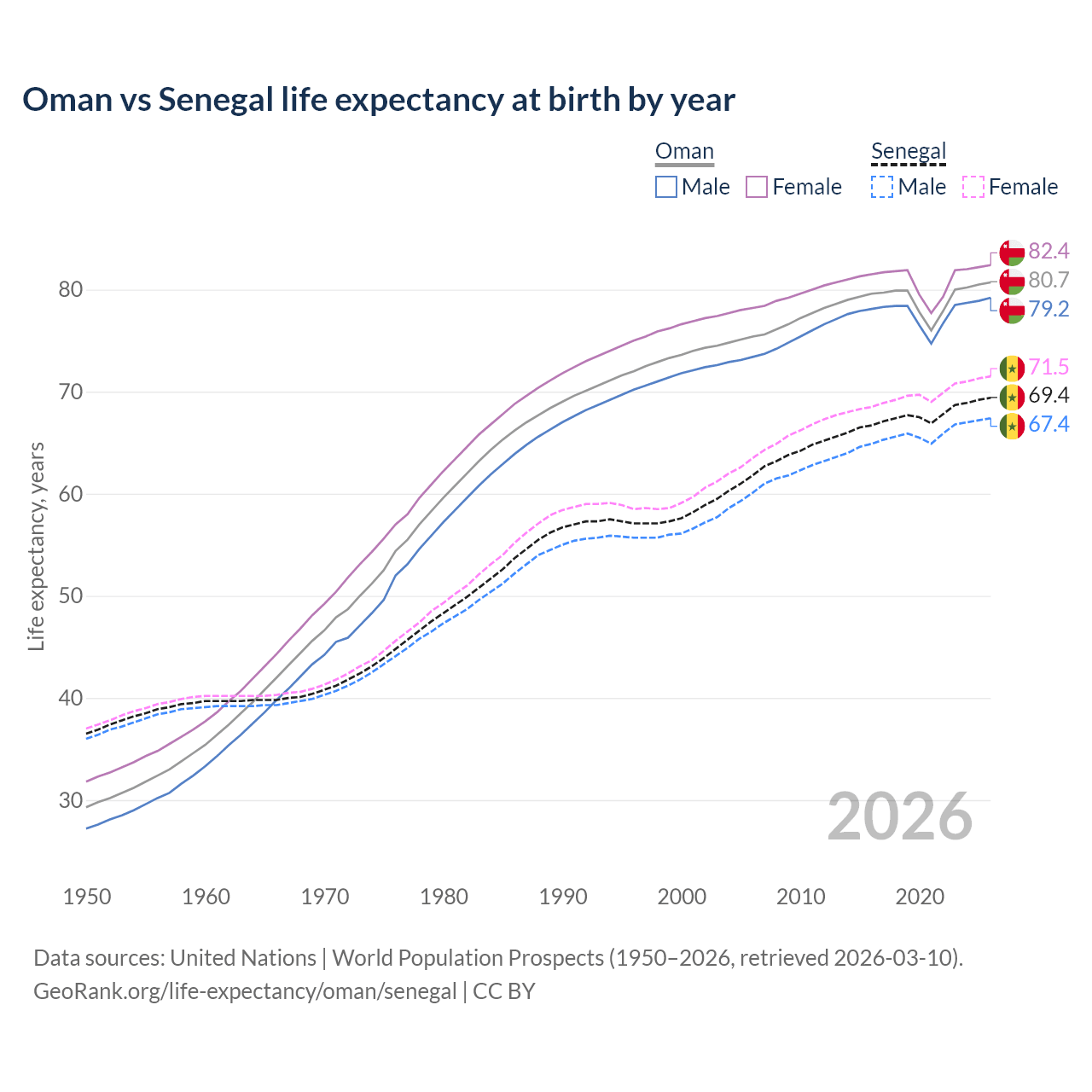 The average life expectancy at birth is 80.7 years in Oman vs 69.4 in Senegal. Oman is ranked 43/197 by life expectancy, and Senegal is 143/197. In Oman, the life expectancy is 79.2 years for males and 82.4 years for females. In Senegal, it's 67.4 years for males and 71.5 years for females.
