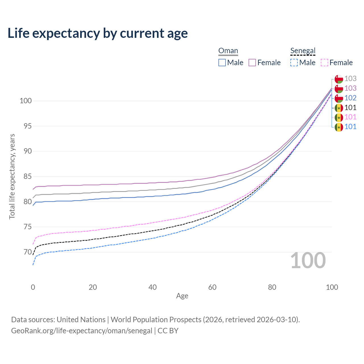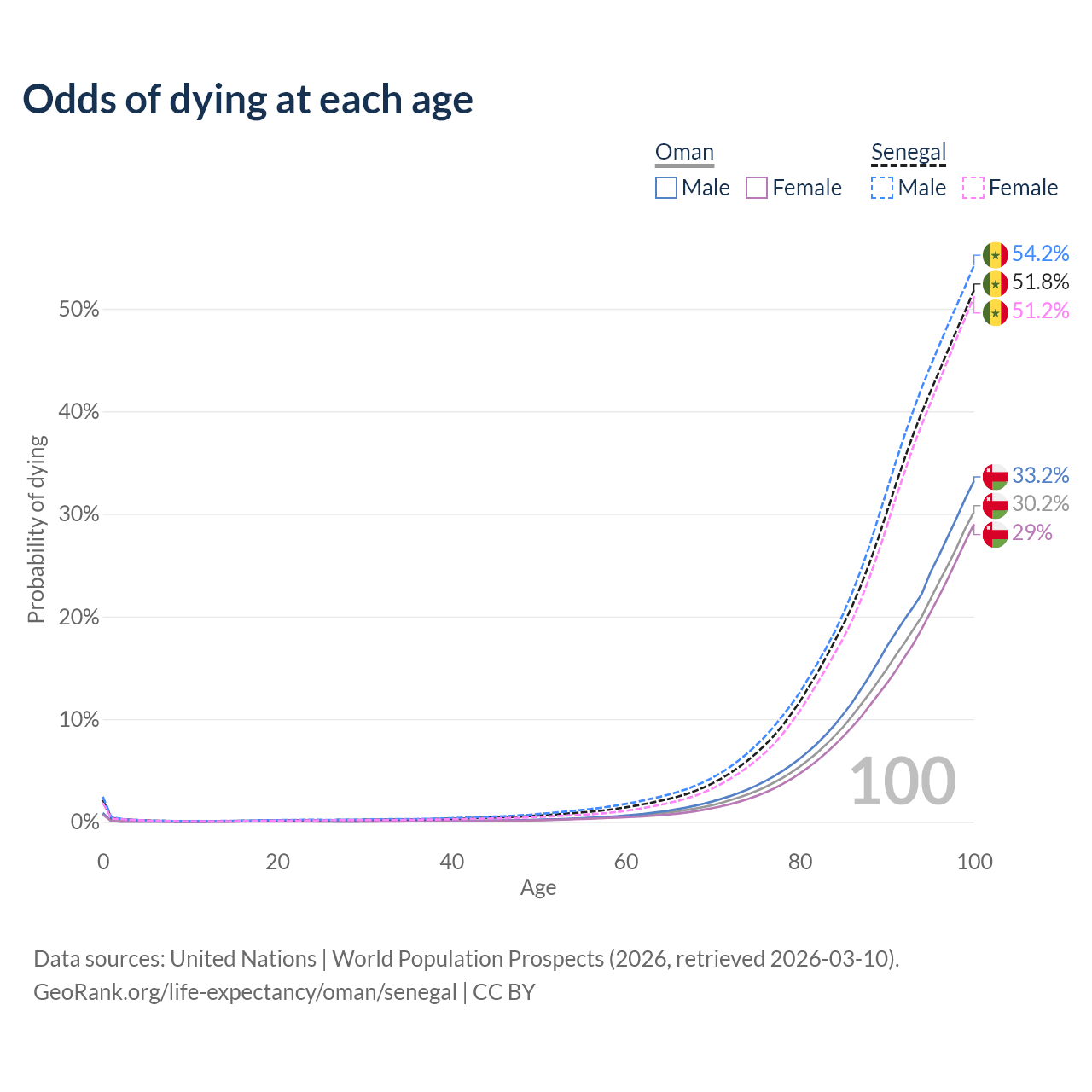 This life expectancy calculator shows the odds of living to 100, 95, 90, and below based on current age for both males and females in Oman and Senegal, along with mean and median age of death. The calculations are based on the 2026 life tables (actuarial tables) from the UN World Population Prospects.