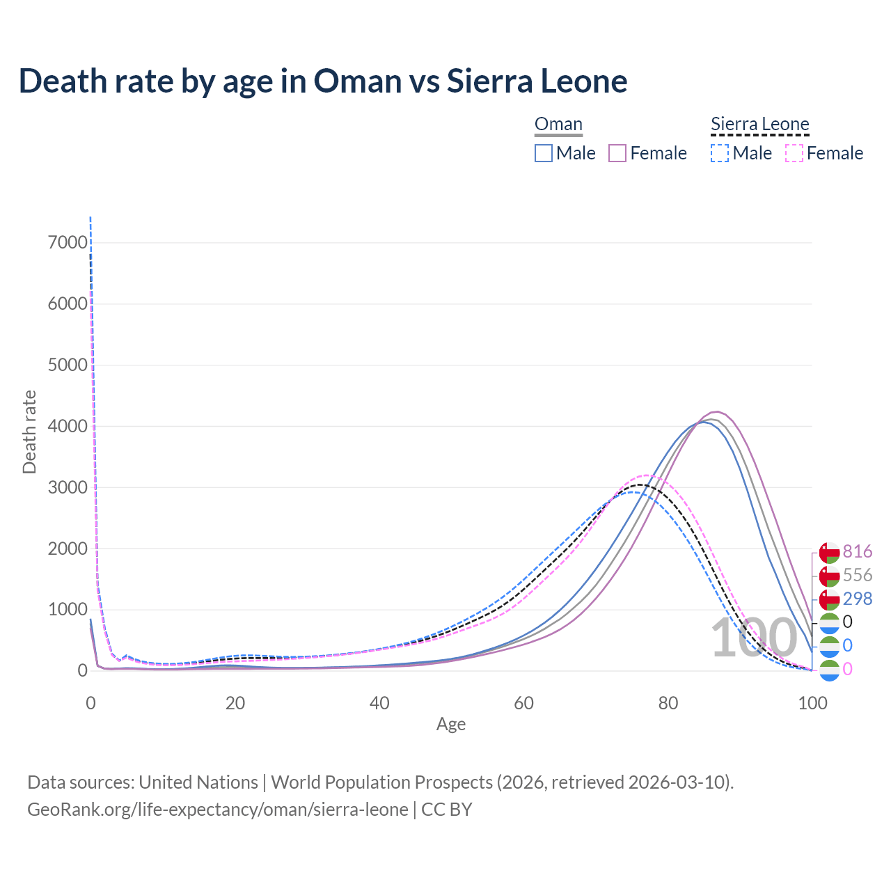 In Oman, the most common age of death is 86, compared to 0 in Sierra Leone. The median age of death is 83.5 in Oman and 70.8 in Sierra Leone, meaning only half of each cohort is expected to live past that age.