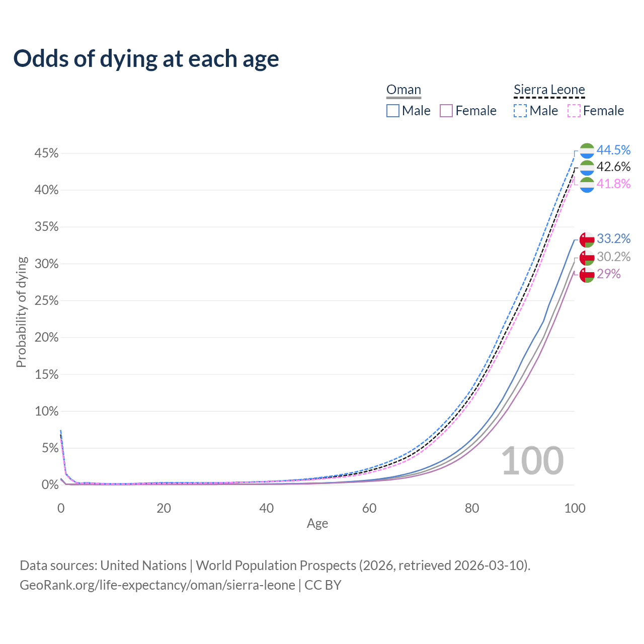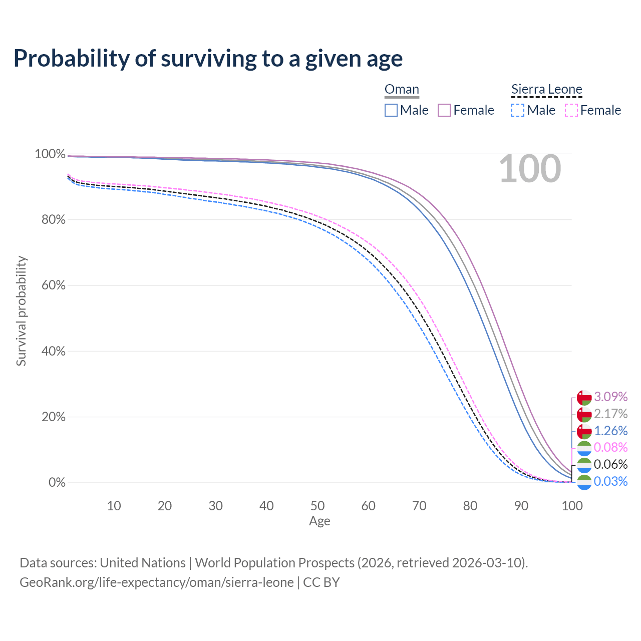This life expectancy calculator shows the odds of living to 100, 95, 90, and below based on current age for both males and females in Oman and Sierra Leone, along with mean and median age of death. The calculations are based on the 2026 life tables (actuarial tables) from the UN World Population Prospects.