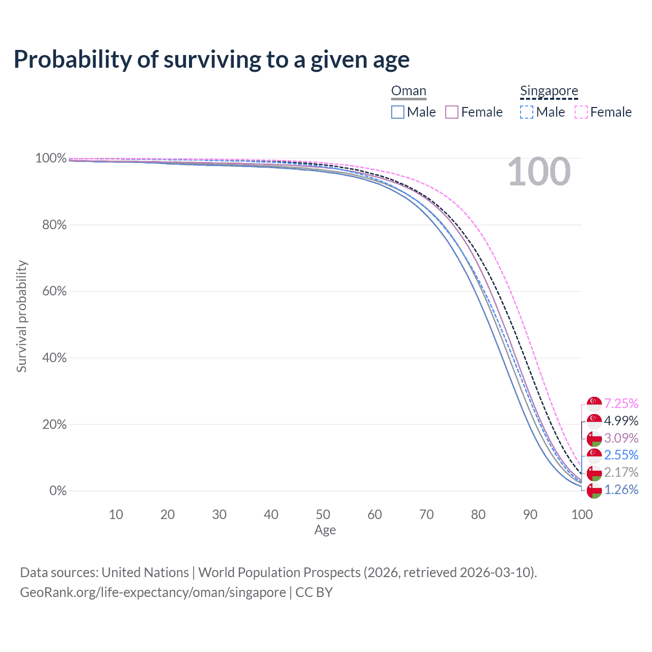 This life expectancy calculator shows the odds of living to 100, 95, 90, and below based on current age for both males and females in Oman and Singapore, along with mean and median age of death. The calculations are based on the 2026 life tables (actuarial tables) from the UN World Population Prospects.