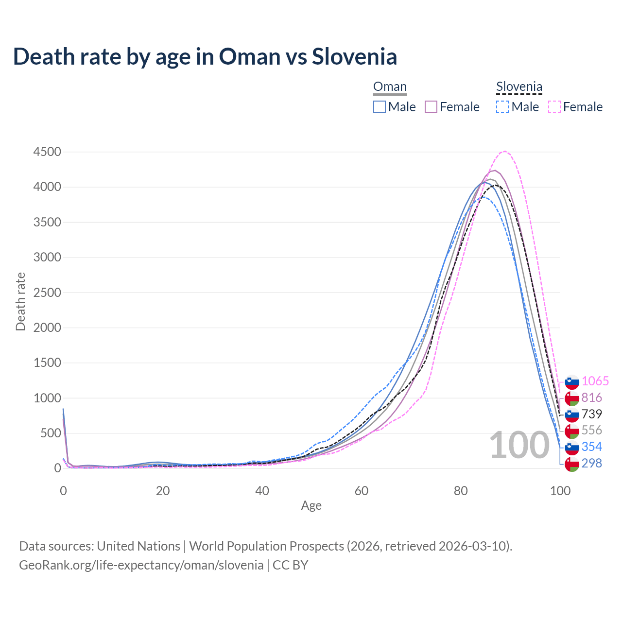 This life expectancy calculator shows the odds of living to 100, 95, 90, and below based on current age for both males and females in Oman and Slovenia, along with mean and median age of death. The calculations are based on the 2026 life tables (actuarial tables) from the UN World Population Prospects.