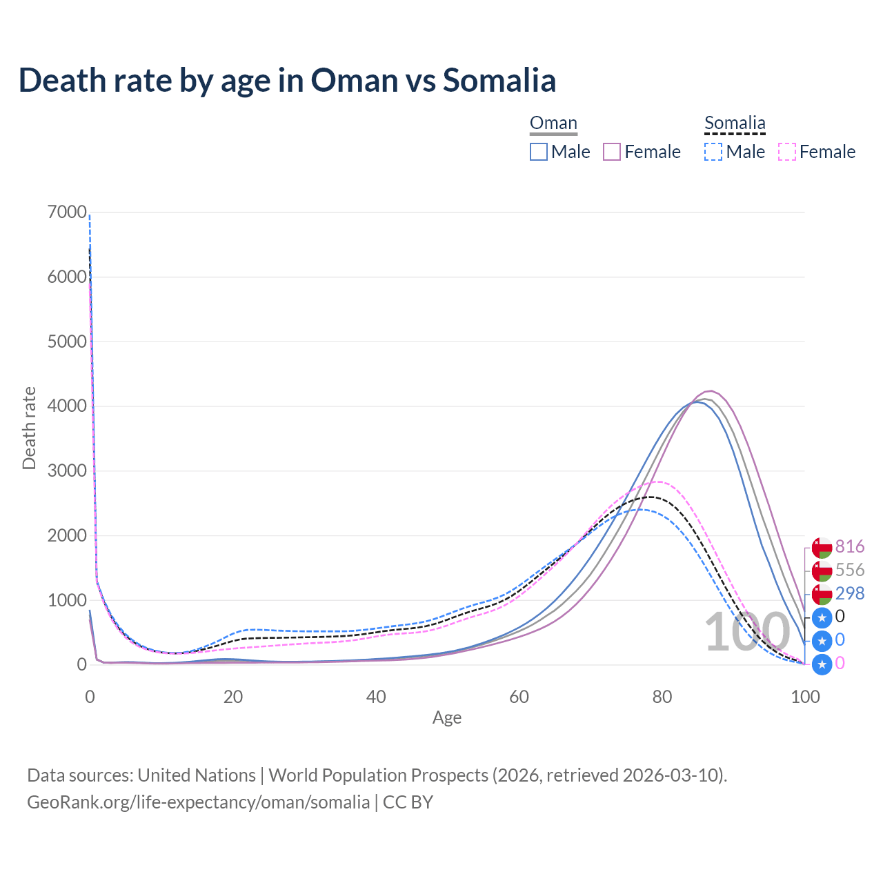 Note that this chart does not show rates per 100,000 population, as those would be skewed by age structure differences and reflect the demographics of Oman and Somalia more than their death rates.