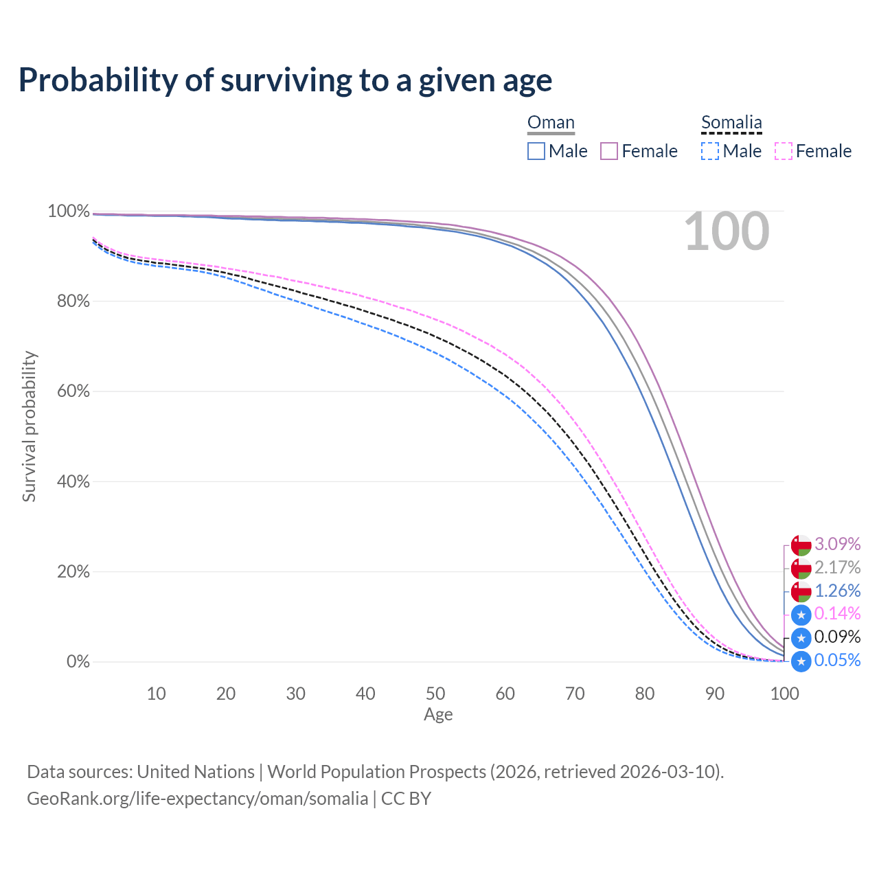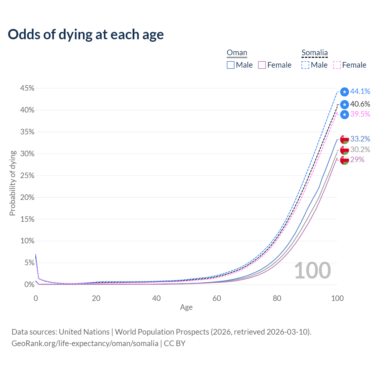 This life expectancy calculator shows the odds of living to 100, 95, 90, and below based on current age for both males and females in Oman and Somalia, along with mean and median age of death. The calculations are based on the 2026 life tables (actuarial tables) from the UN World Population Prospects.