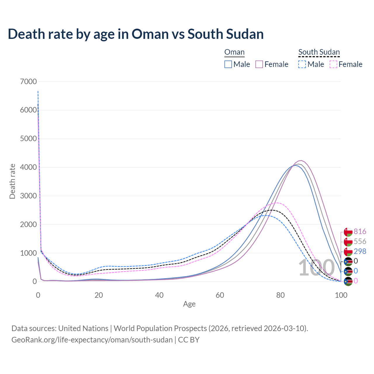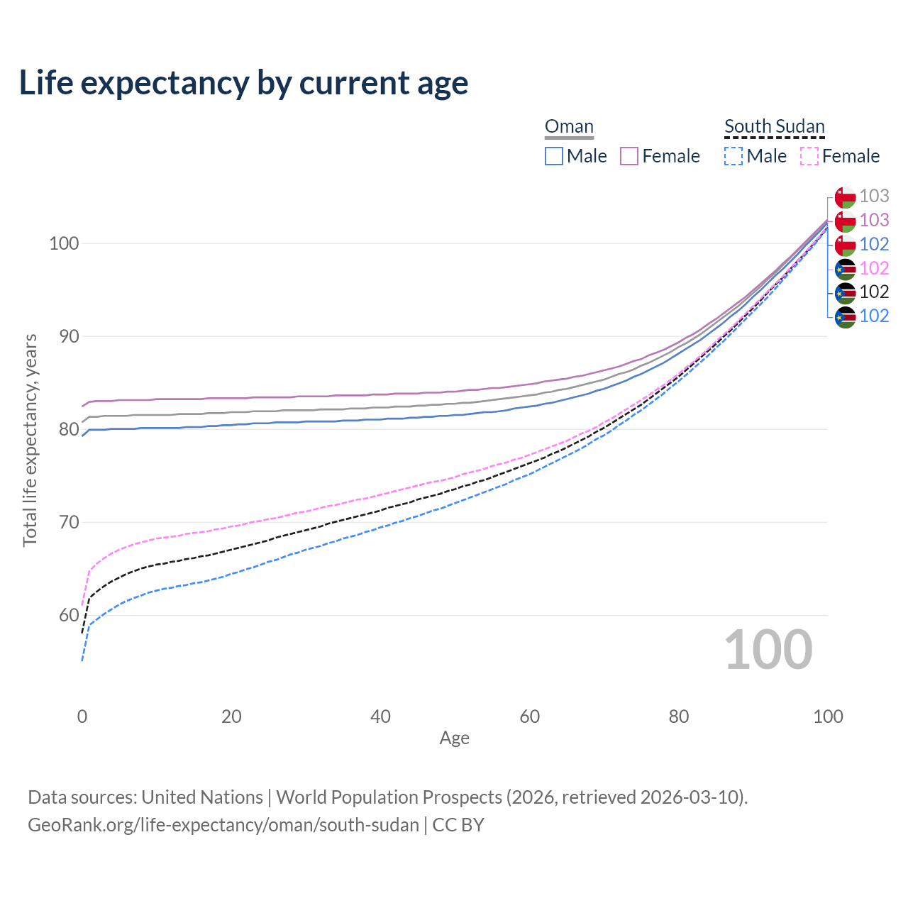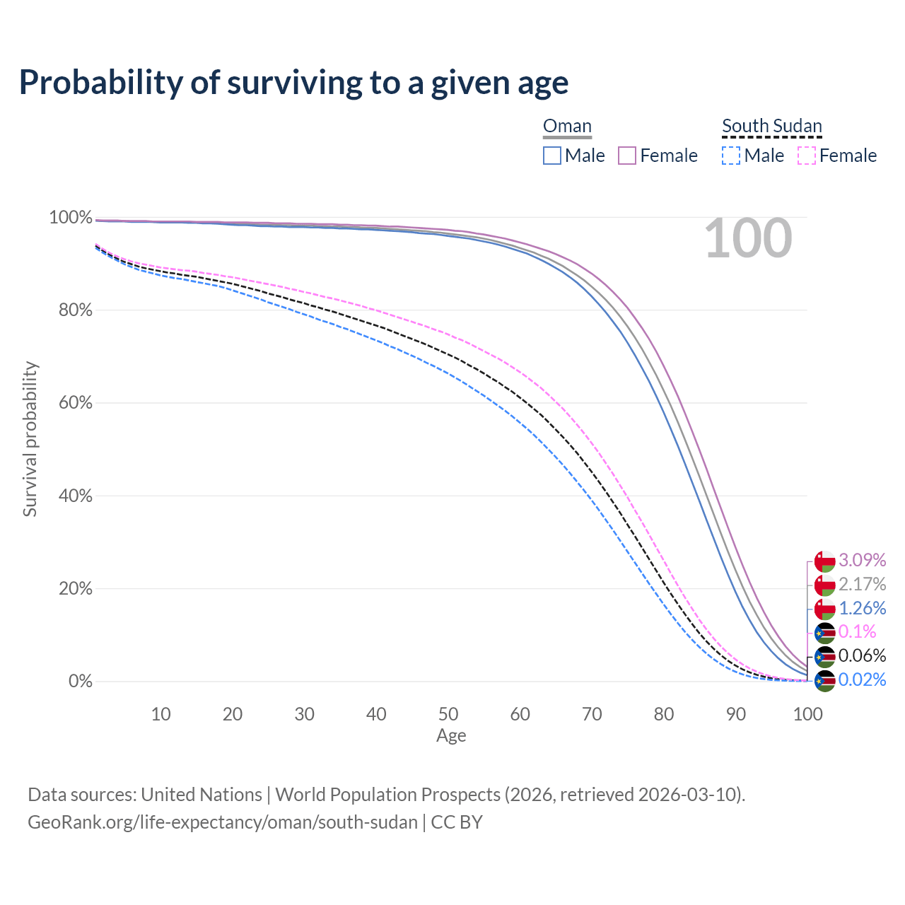 This life expectancy calculator shows the odds of living to 100, 95, 90, and below based on current age for both males and females in Oman and South Sudan, along with mean and median age of death. The calculations are based on the 2026 life tables (actuarial tables) from the UN World Population Prospects.