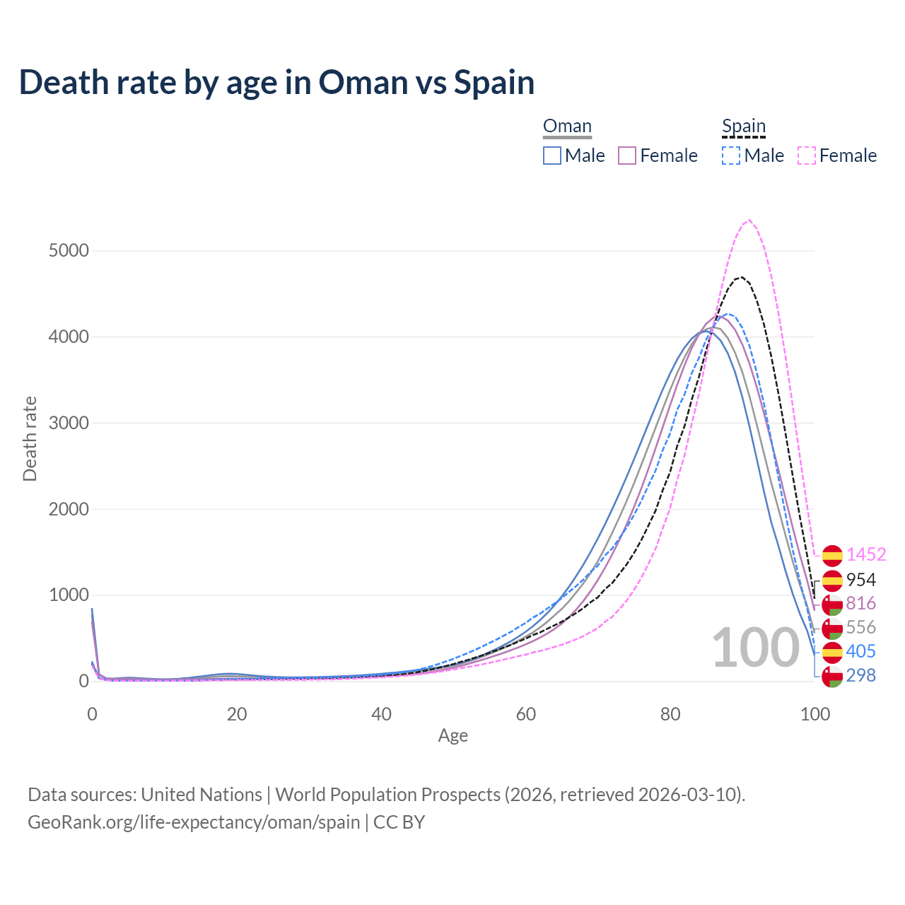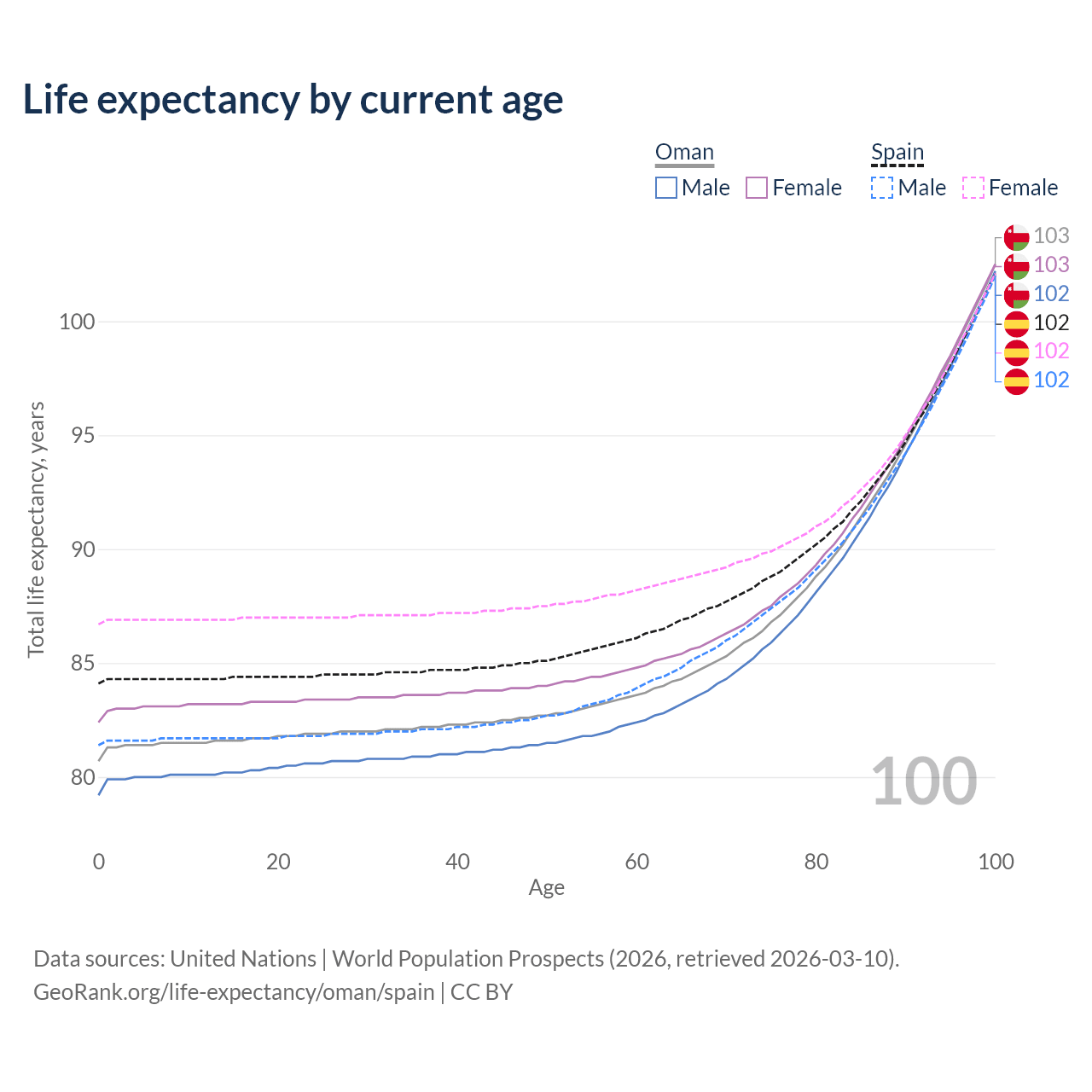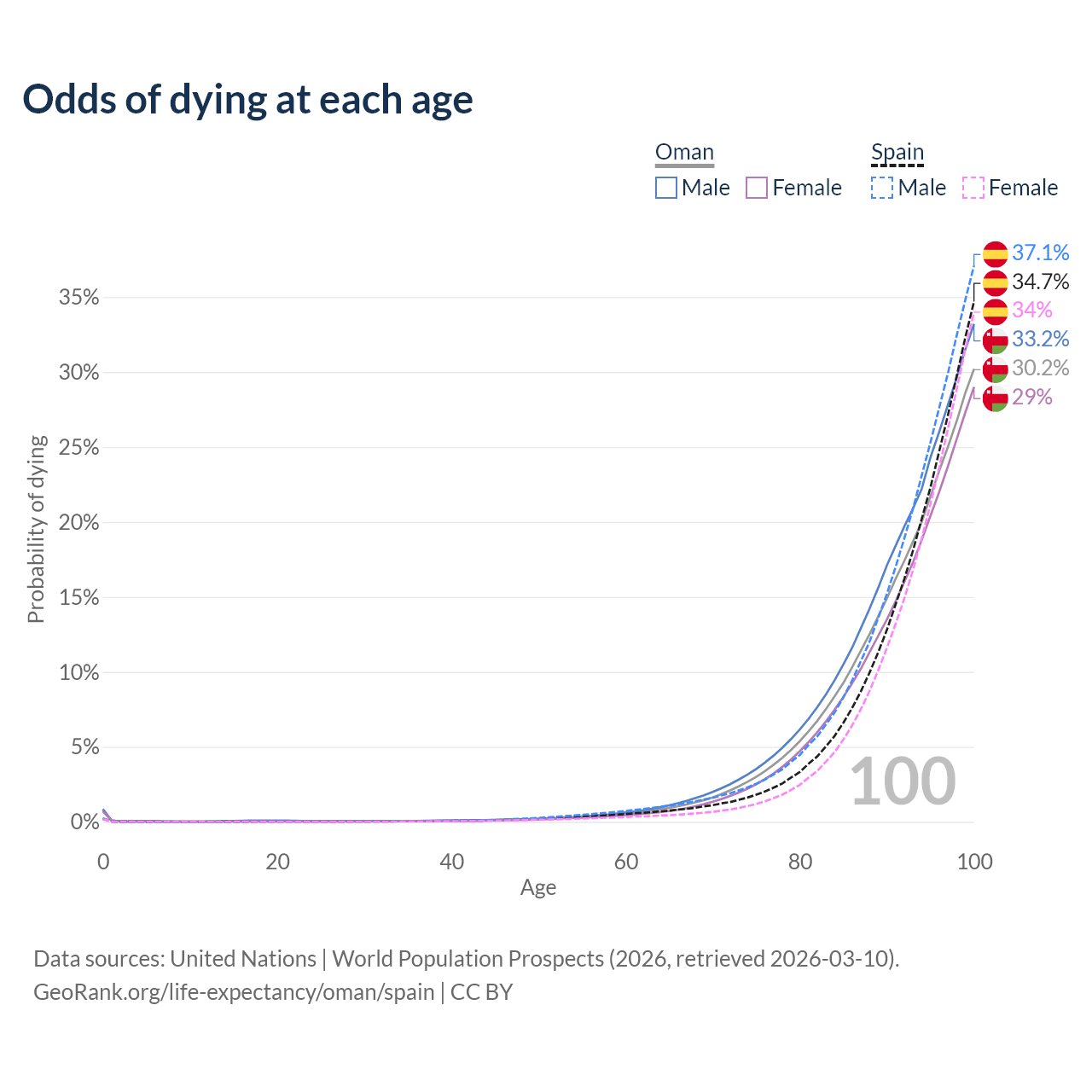 This life expectancy calculator shows the odds of living to 100, 95, 90, and below based on current age for both males and females in Oman and Spain, along with mean and median age of death. The calculations are based on the 2026 life tables (actuarial tables) from the UN World Population Prospects.