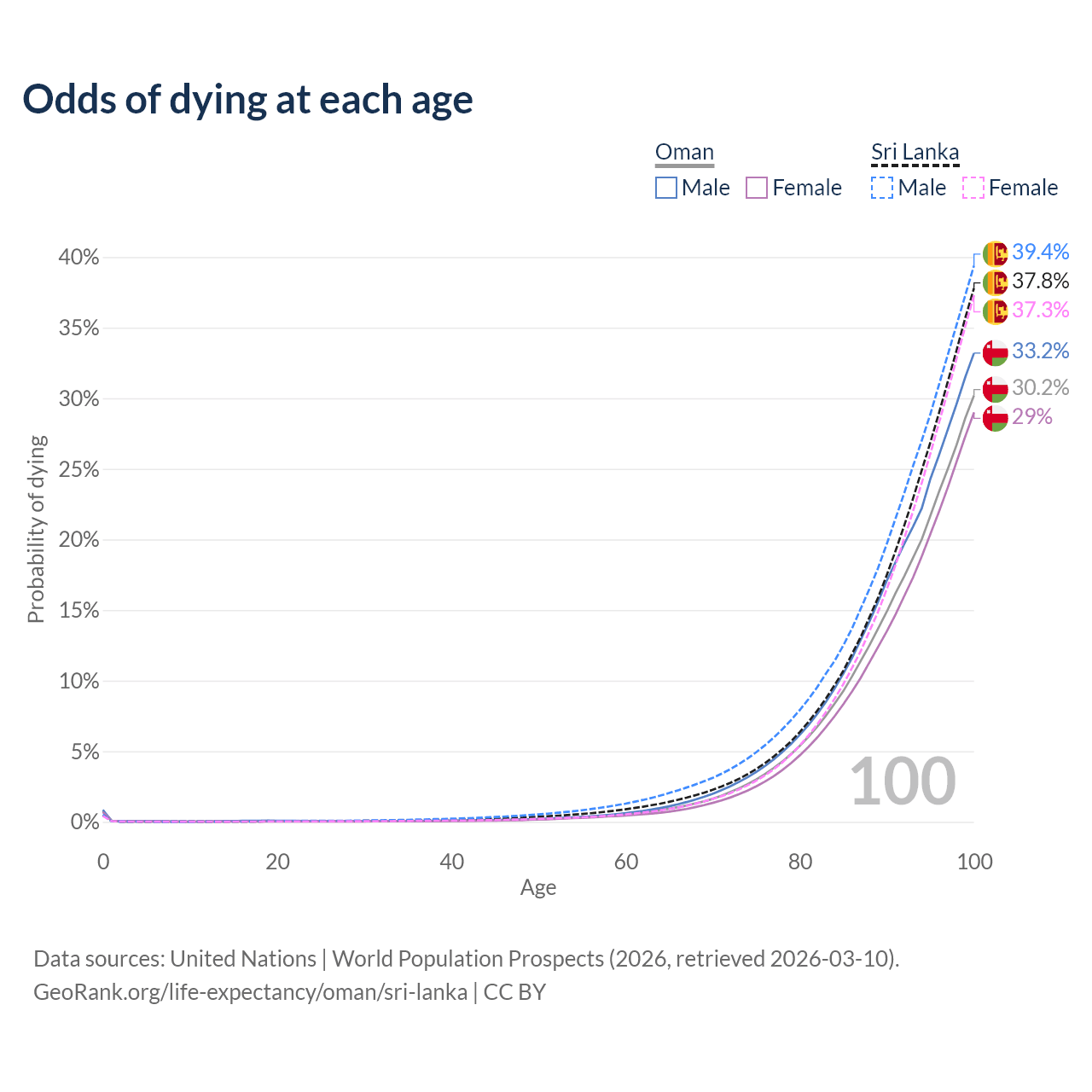 This life expectancy calculator shows the odds of living to 100, 95, 90, and below based on current age for both males and females in Oman and Sri Lanka, along with mean and median age of death. The calculations are based on the 2026 life tables (actuarial tables) from the UN World Population Prospects.