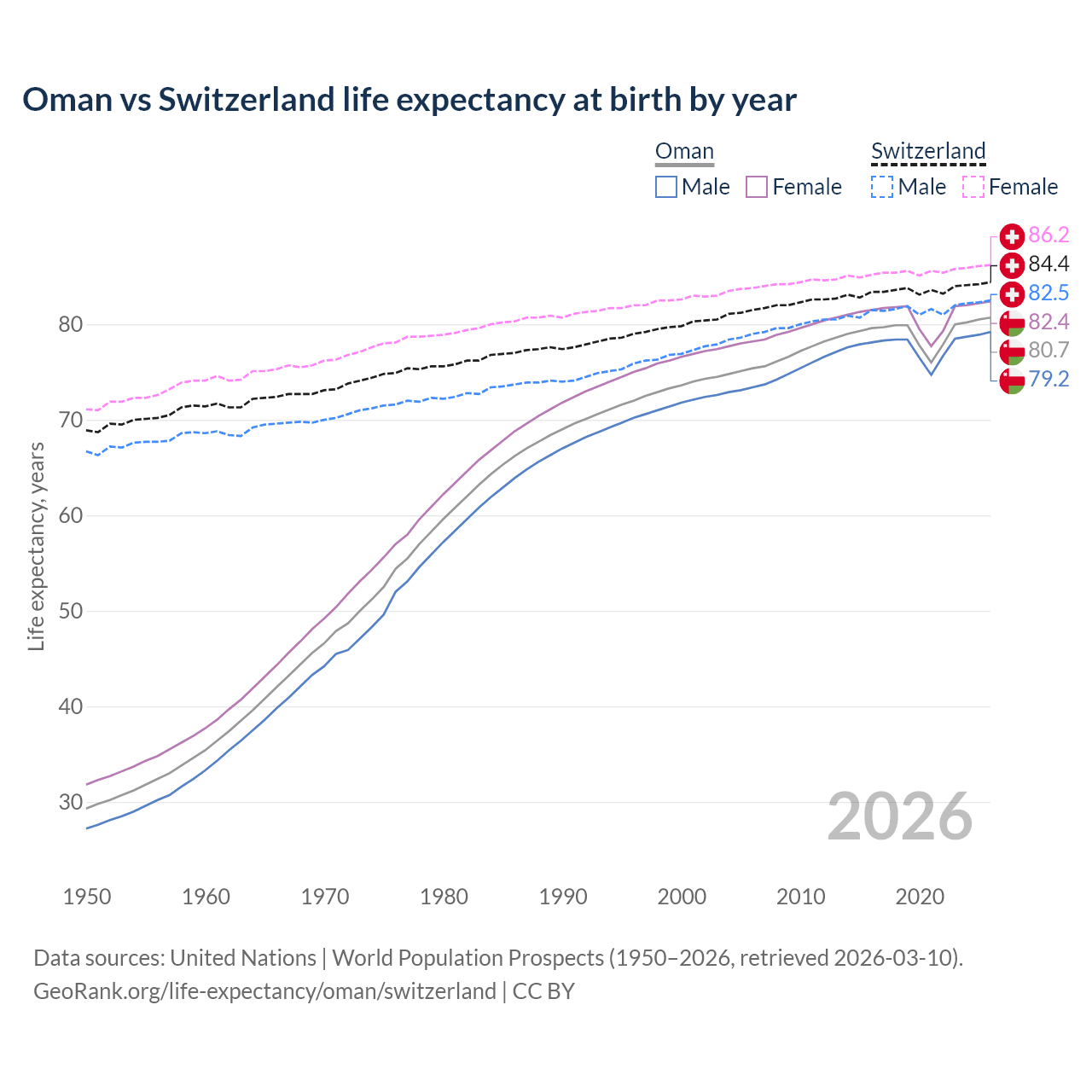 The average life expectancy at birth is 80.7 years in Oman vs 84.4 in Switzerland. Oman is ranked 43/197 by life expectancy, and Switzerland is 6/197. In Oman, the life expectancy is 79.2 years for males and 82.4 years for females. In Switzerland, it's 82.5 years for males and 86.2 years for females.