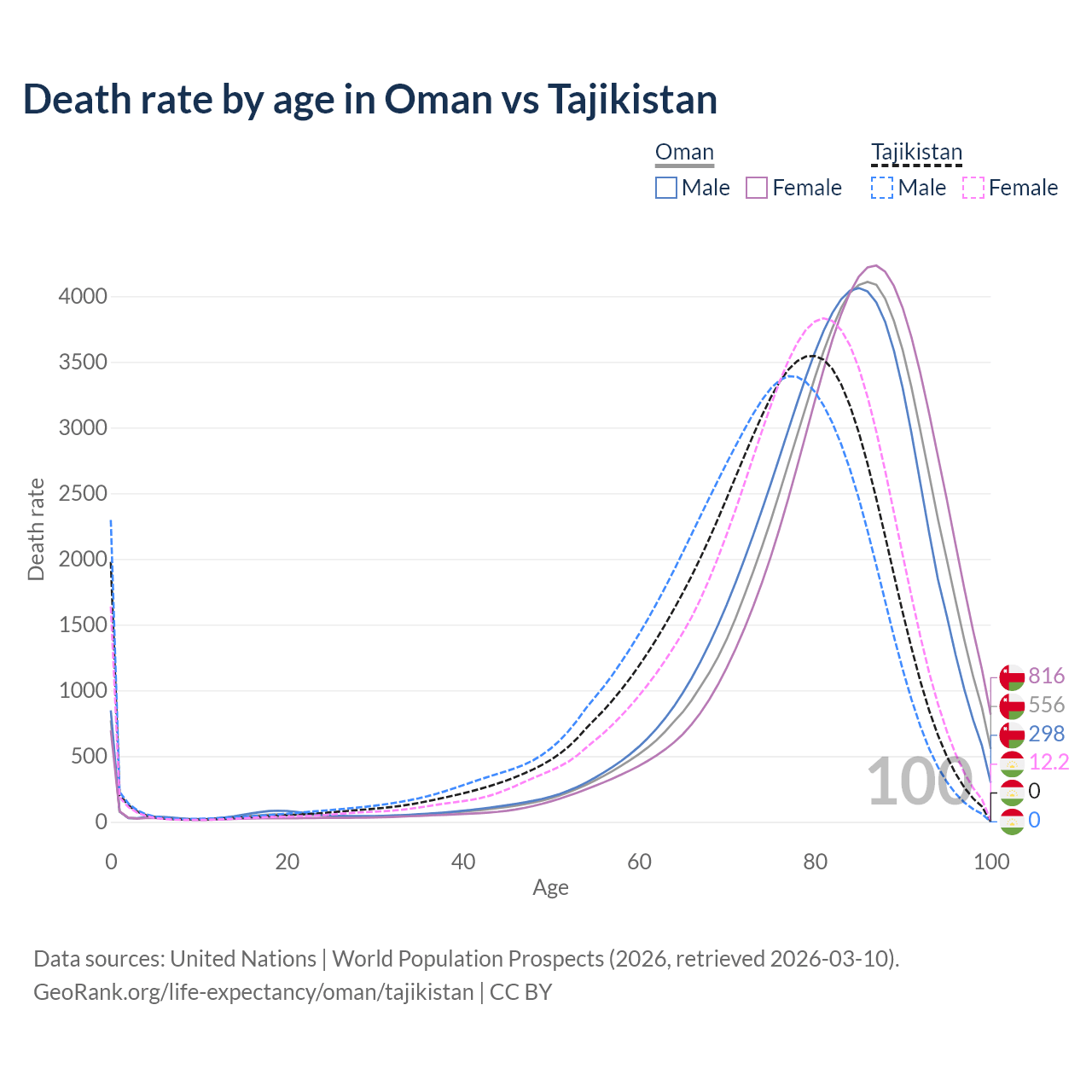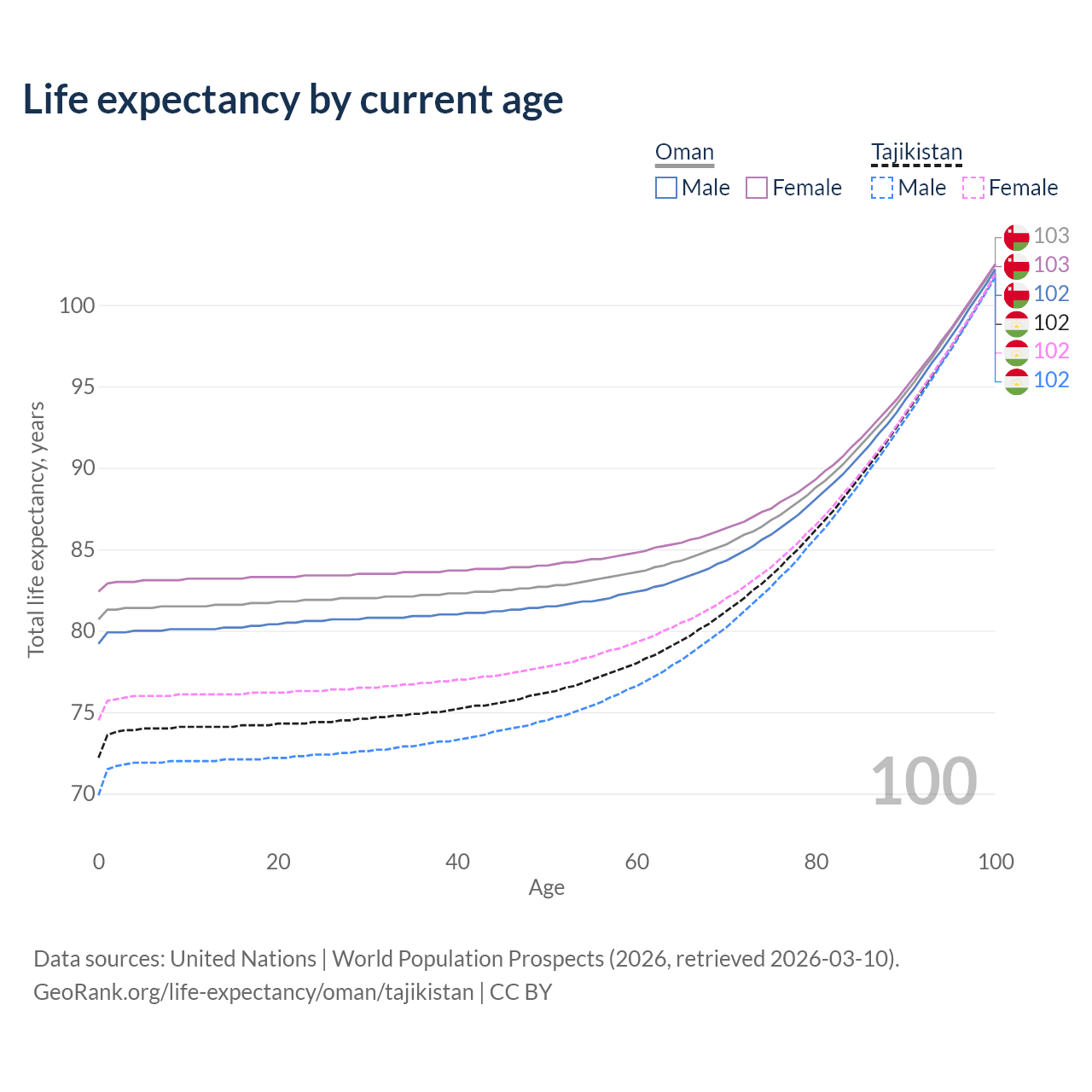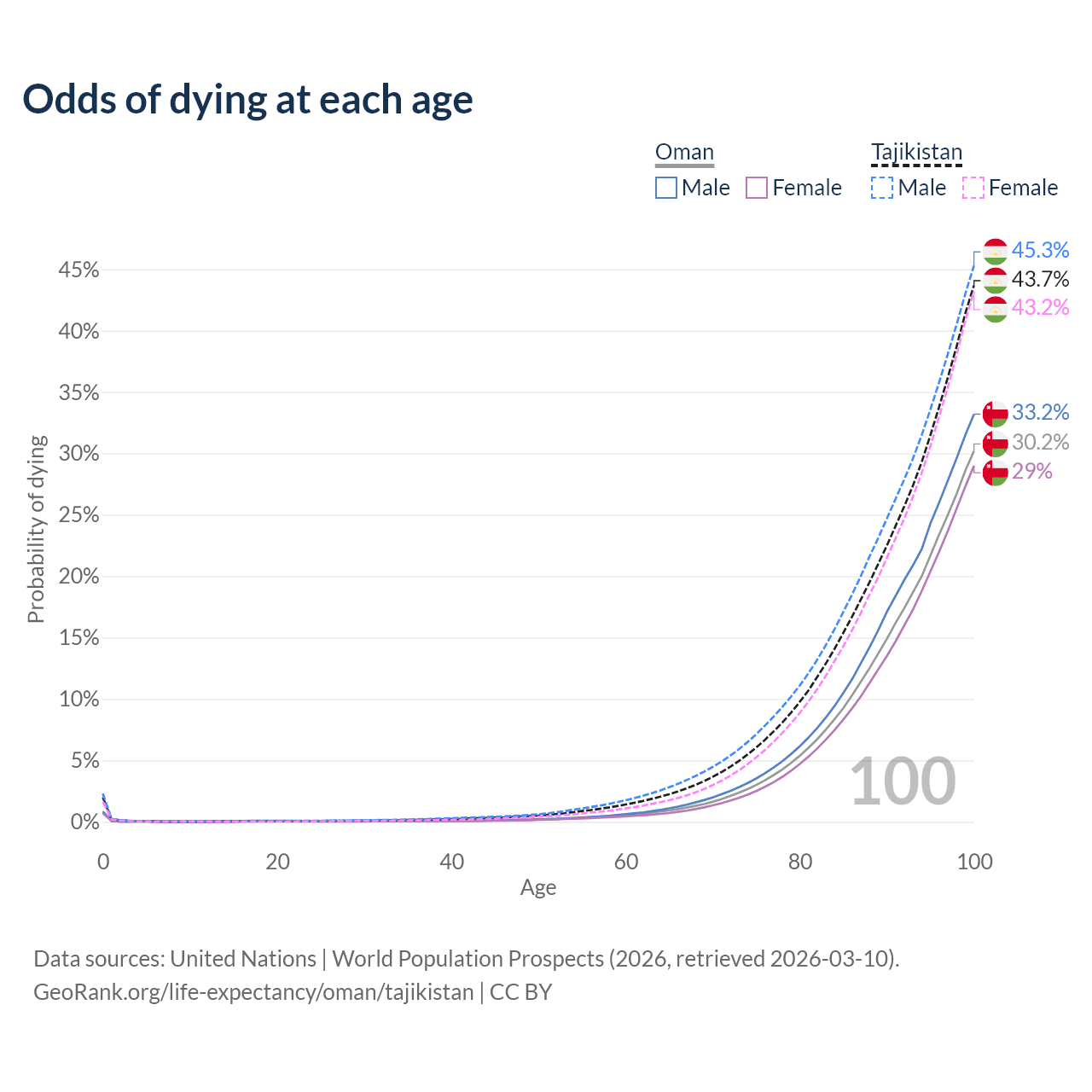 This life expectancy calculator shows the odds of living to 100, 95, 90, and below based on current age for both males and females in Oman and Tajikistan, along with mean and median age of death. The calculations are based on the 2026 life tables (actuarial tables) from the UN World Population Prospects.